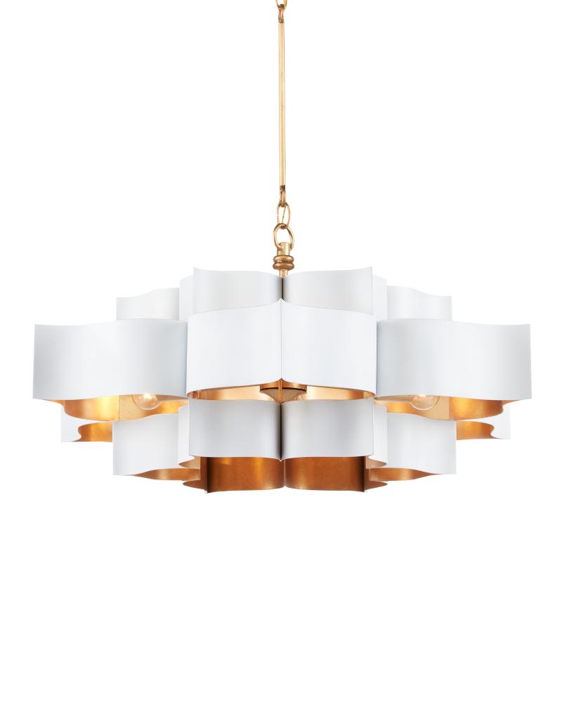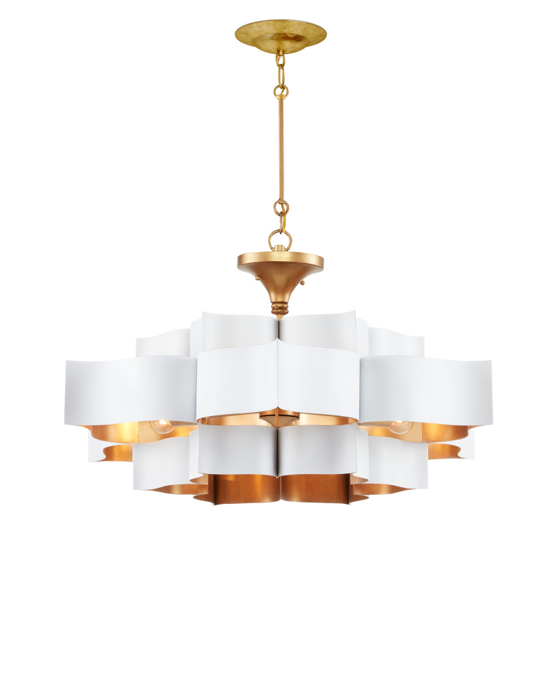 The Grand Lotus White Chandelier receives its majestic good looks from a combination of stunning workmanship and a mix of sugar white and contemporary gold leaf finishes. The white chandelier is skillfully fashioned from wrought iron. Adjustable from 16" to 100" with use of included chain/rod kit/cable. If your space calls for a longer drop, additional chain/rods/cable is available for purchase.