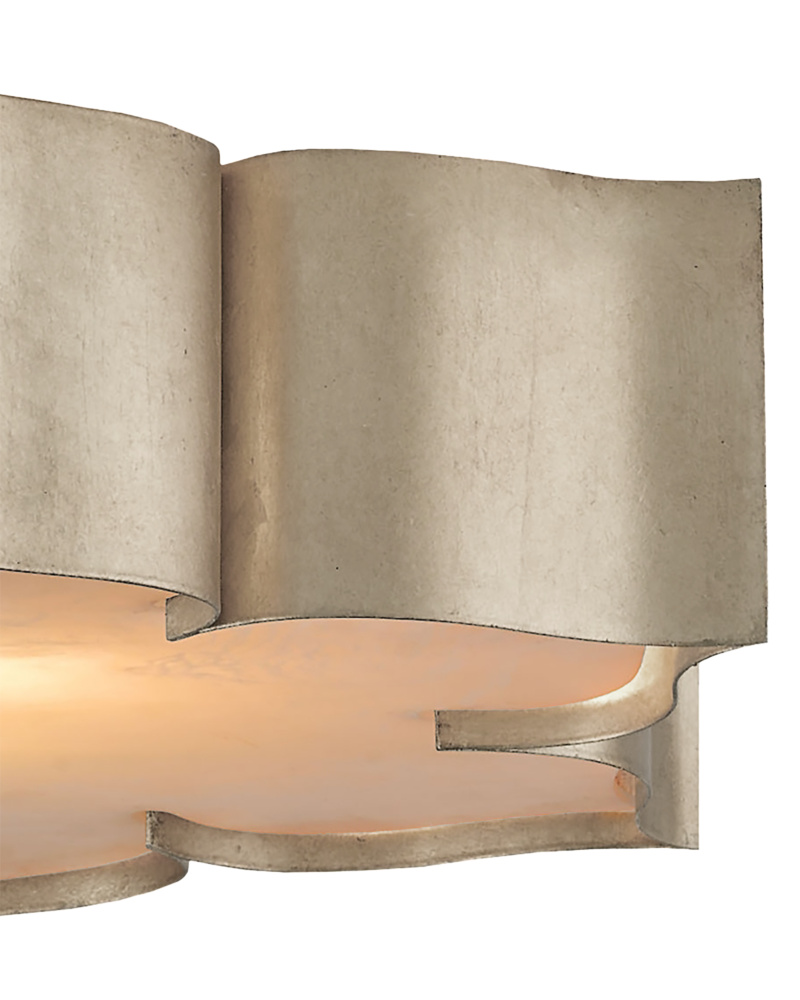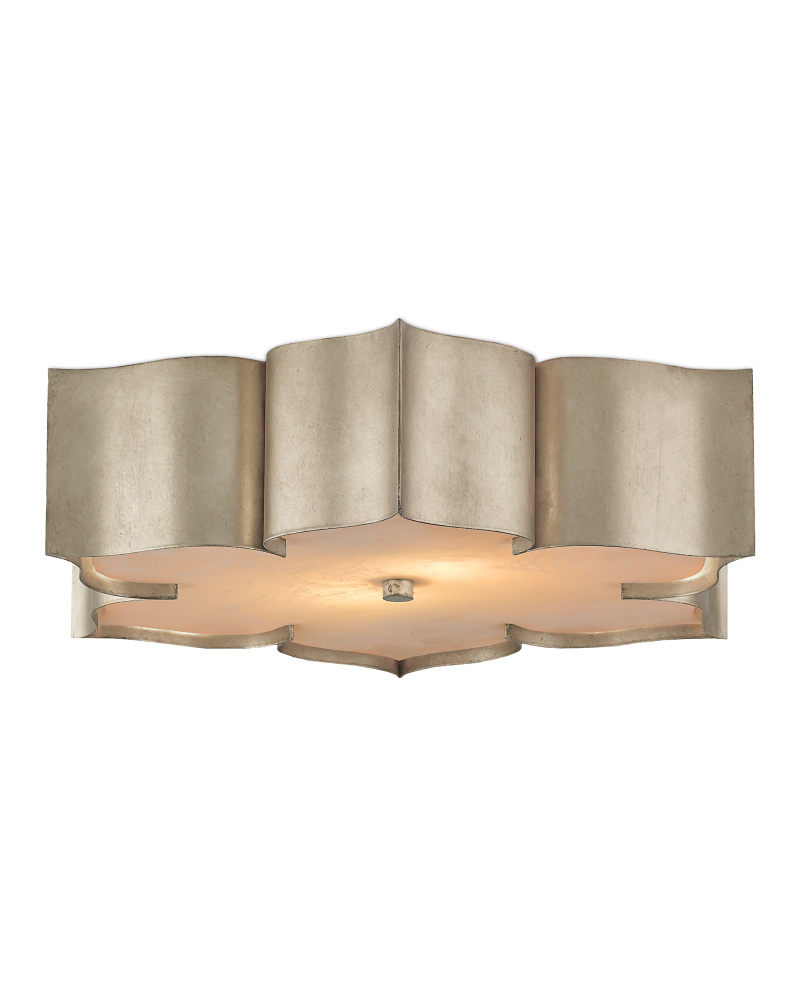 The Grand Lotus Silver Flush Mount receives its majestic good looks from a combination of stunning workmanship and antique contemporary silver leaf finish. The silver flush mount is skillfully fashioned from wrought iron.