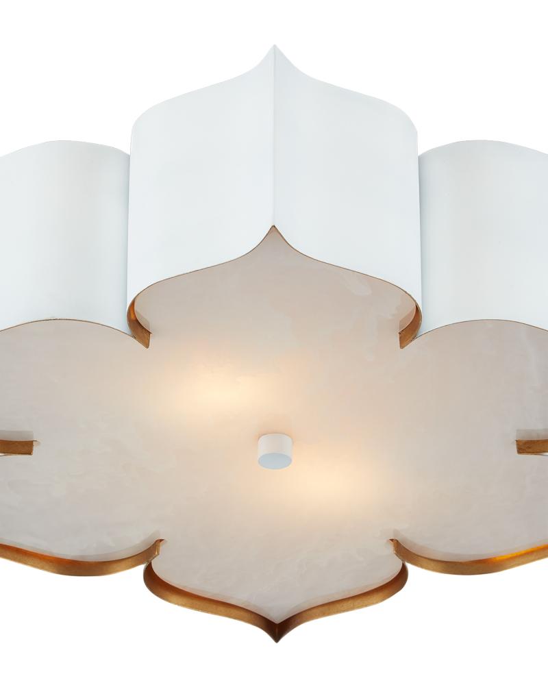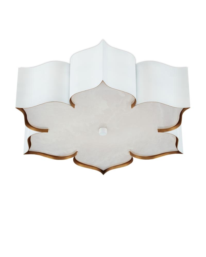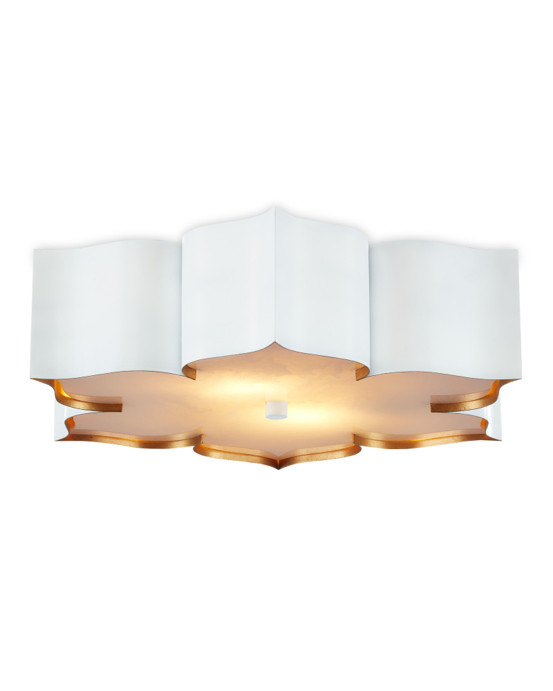 The Grand Lotus White Flush Mount receives its good looks from a combination of stunning workmanship and a mix of sugar white and contemporary gold leaf finishes. The white chandelier is skillfully fashioned from wrought iron.