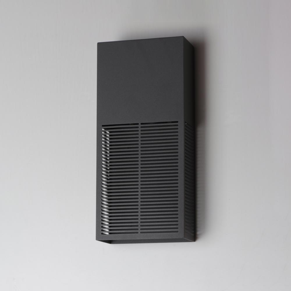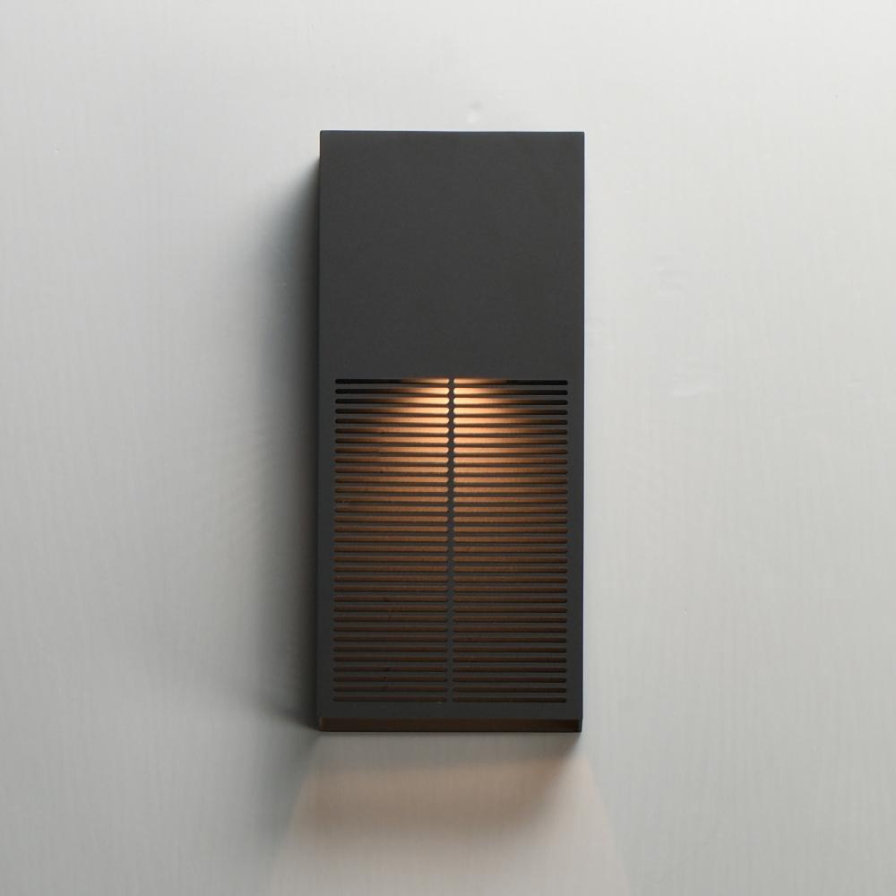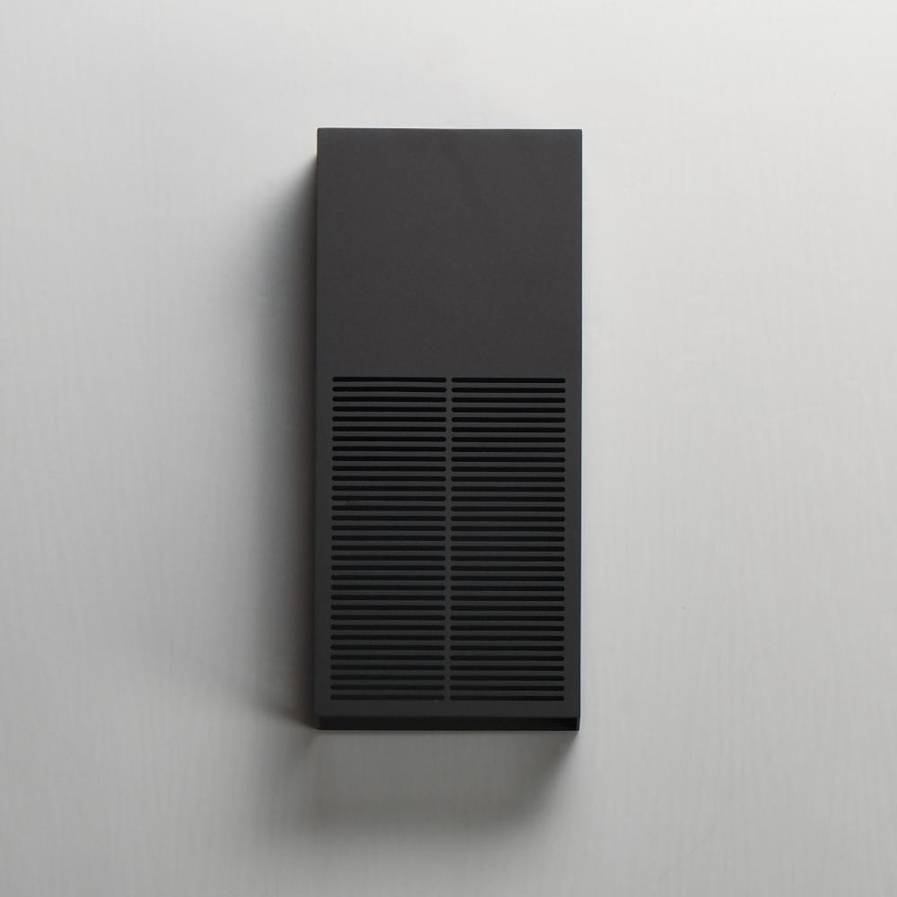 An array of precise slits are stacked in two columns on rectangular shade forms of various sizes. Housed in a blocked out space is a recessed LED light source that casts a filigree that radiate onto the surface surrounding the sconce making a dazzling disp