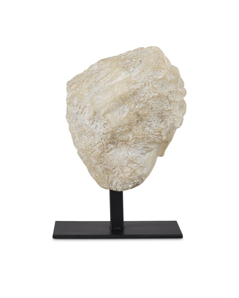 Though the Greek Princess Head Fragment looks as if it has survived since ancient times, it is actually made of composite and inspired by a museum piece that was a valuable antique. The skill of the artisans who created it is evident, not only in how the broken areas are so convincing but in the aged-beige finish that fools the eye into thinking it is carved from stone. The beige sculpture is fastened to a black metal base, which is also museum-style.