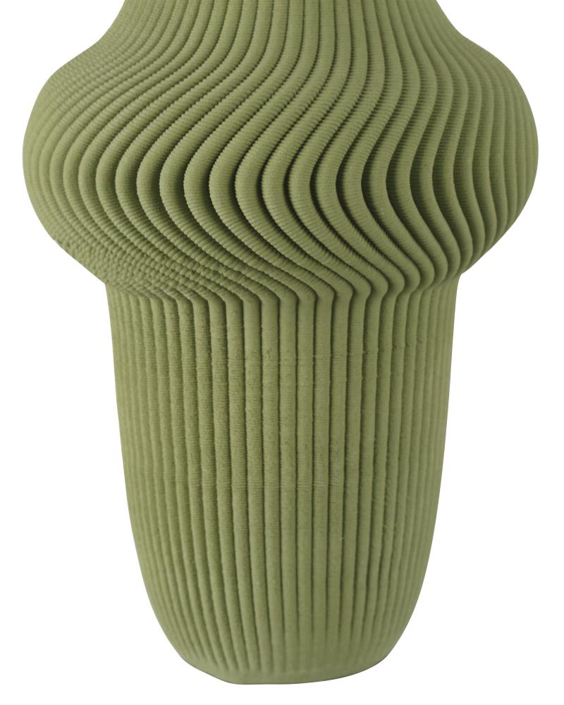 The Green Plisse Large Vase is attractive in a lovely hue of olive green. The deep furrows that that swirl around the bulge in its form tighten and straighten as they flow to the top and to the bottom in a uniformity that can only be machine made. The most surprising thing about this handsome vessel is that it is made of 3D-printed porcelain, an ancient material you might not expect to be so amenable to such a contemporary process.