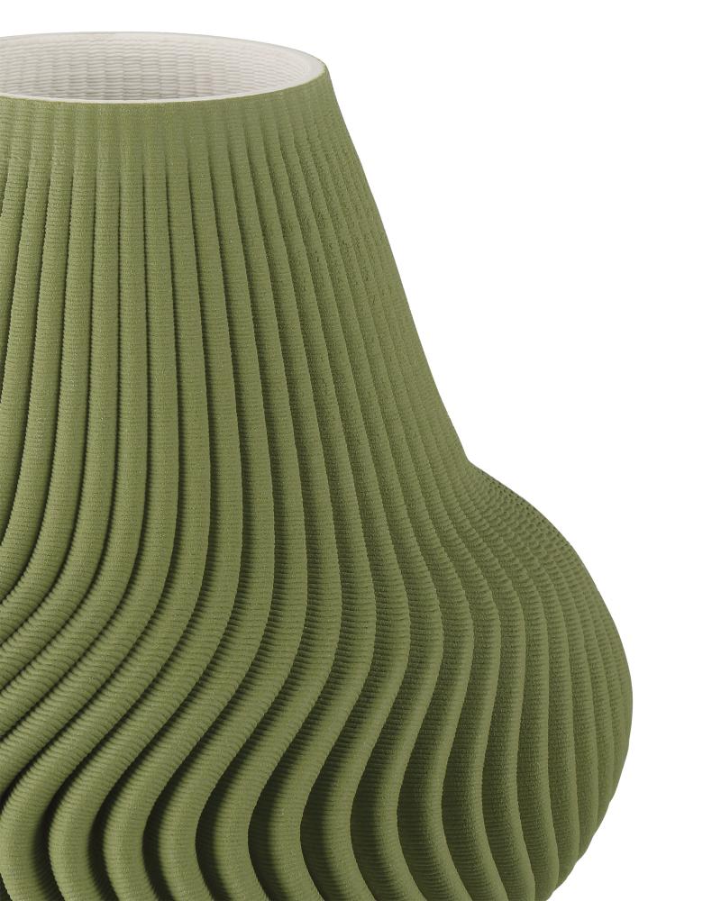 The Green Plisse Medium Vase is attractive in a lovely hue of olive green. The deep furrows that that swirl around the bulge in its form tighten and straighten as they flow to the top and to the bottom in a uniformity that can only be machine-made. The most surprising thing about this handsome vessel is that it is made of 3D-printed porcelain, an ancient material you might not expect to be so amenable to such a contemporary process.