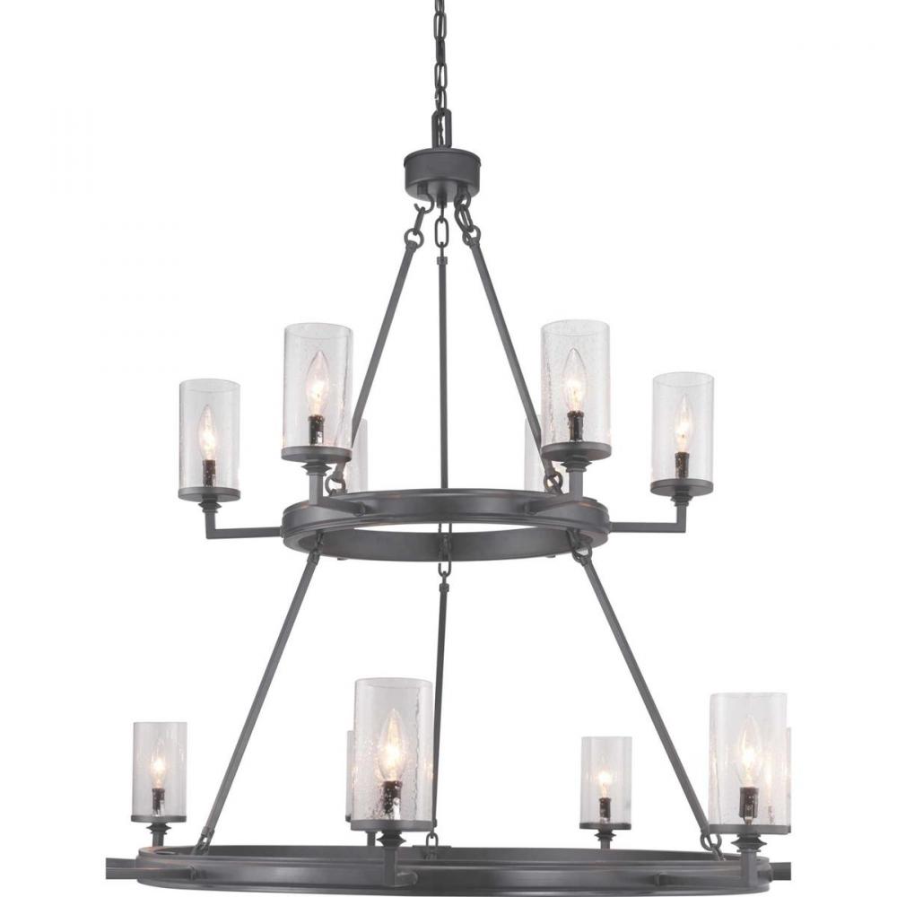 Graphite finishes and organic seeded-glass shades form the basis of this collection that channels traditional iron structures;This 15-light, concentric two-tier chandelier is ideal for a great room, library or large entry foyer;This fixture feels most at h