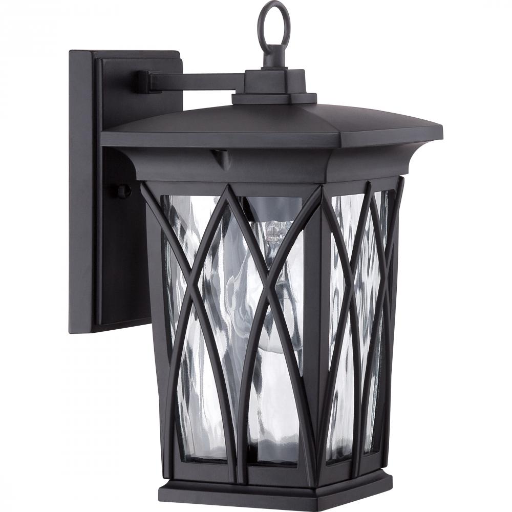 Grover is a definitive design of Craftsman sensibilities updated with a Contemporary twist. The base is finished in classic Mystic Black a smooth matte finish perfect for complementing your home. The curved bands enclosing the clear water glass add the