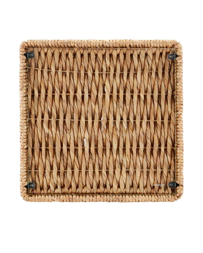 The Hadi Accent Table is a generously sized side table that fits squarely within a natural materials story, with beautiful water hyacinth rope that is wrapped around the metal frame in a sophisticated square hourglass shape. The dexterity required to create such a seamless weave makes this an artisanal creation. The inset top is made of tempered glass.