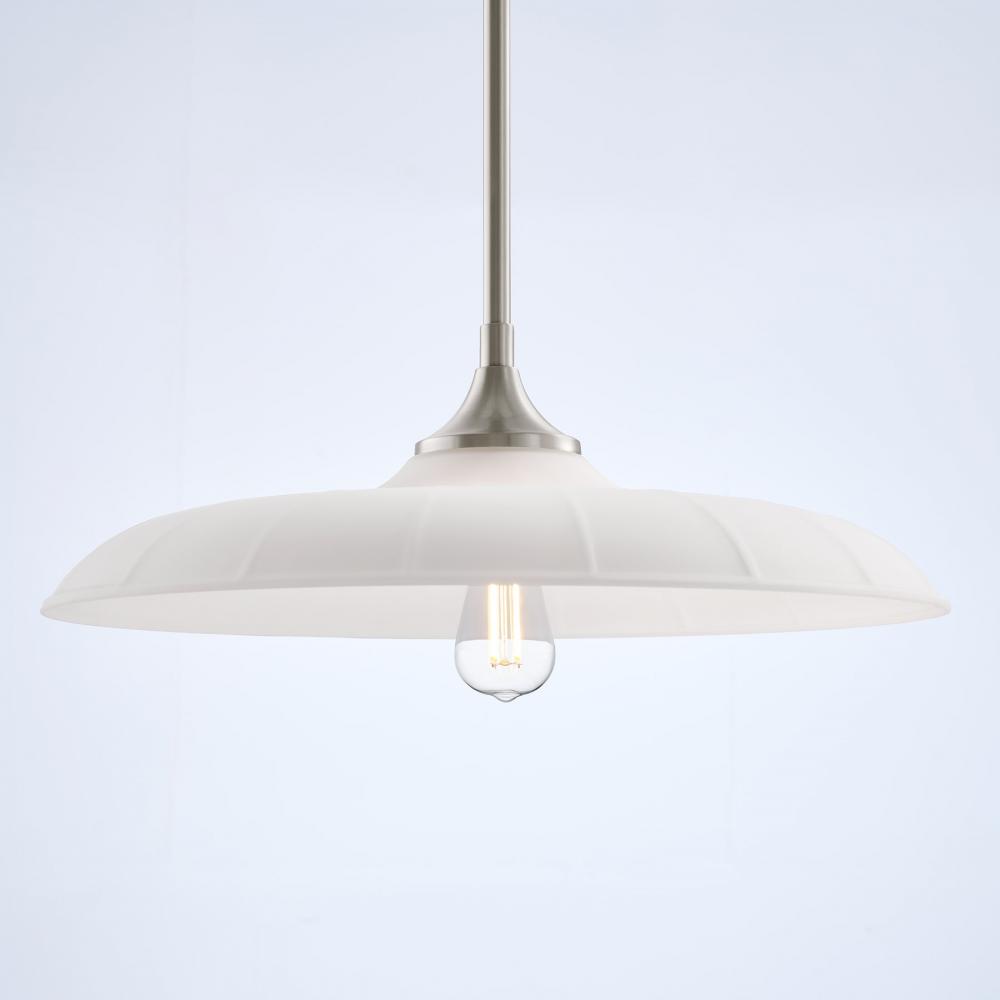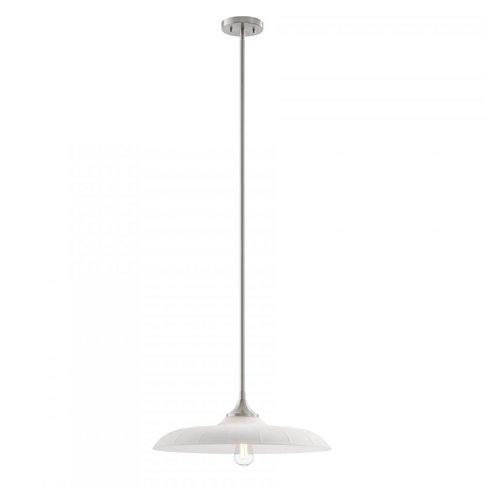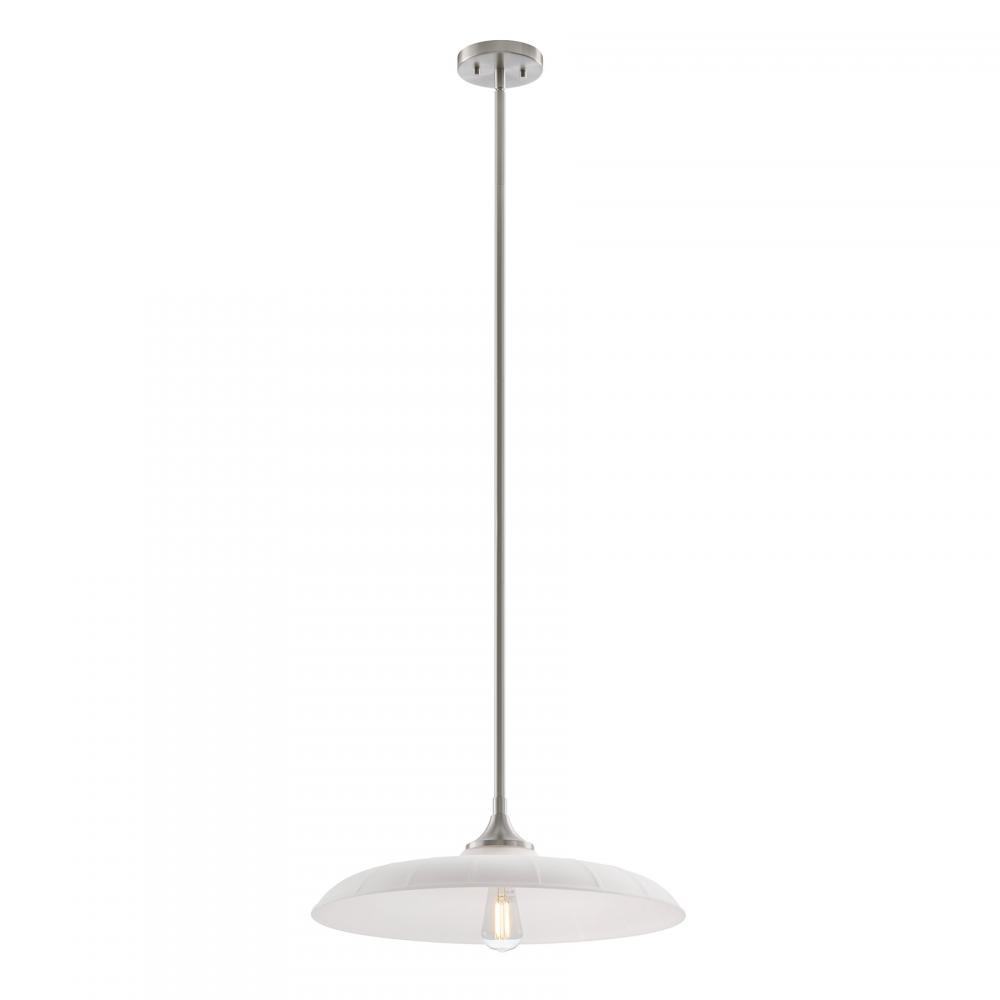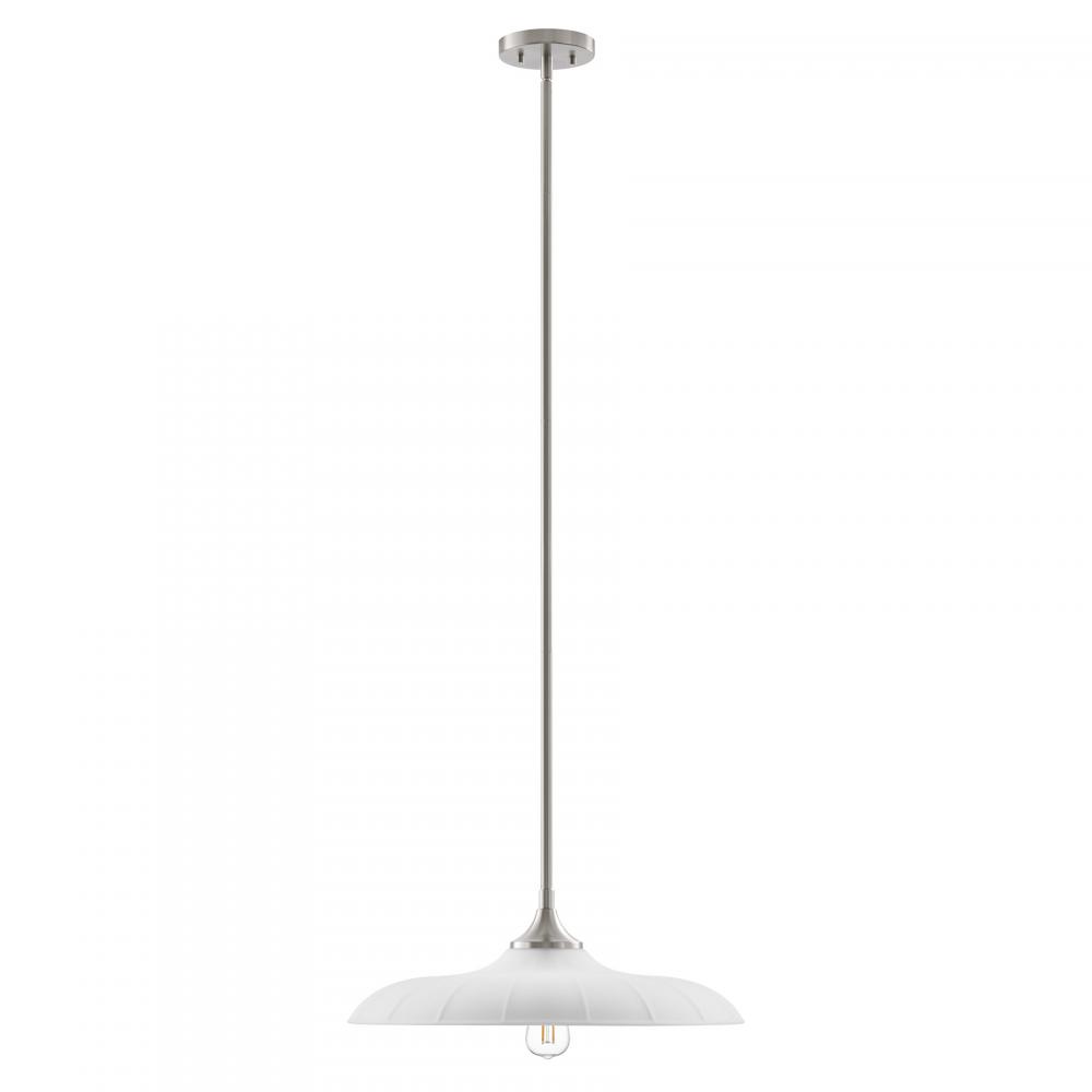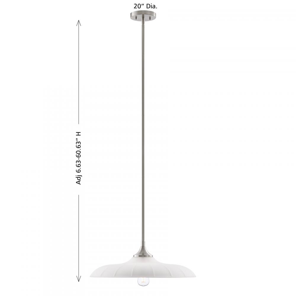 Welcome a look inspired by vintage workshop style with the Savoy House Hadley 1-light pendant. Its sleek, standout shade of subtly ribbed opal glass pairs beautifully with the Satin Nickel finish. Use it solo or in groupings for a big boost of appeal! Hadley is 20" in width and has an adjustable height ranging from 6.63" to 60.63". It uses one standard size bulb of up to 60 watts. Bulb not included. Comes with four 12" downrods and one 6" downrod.