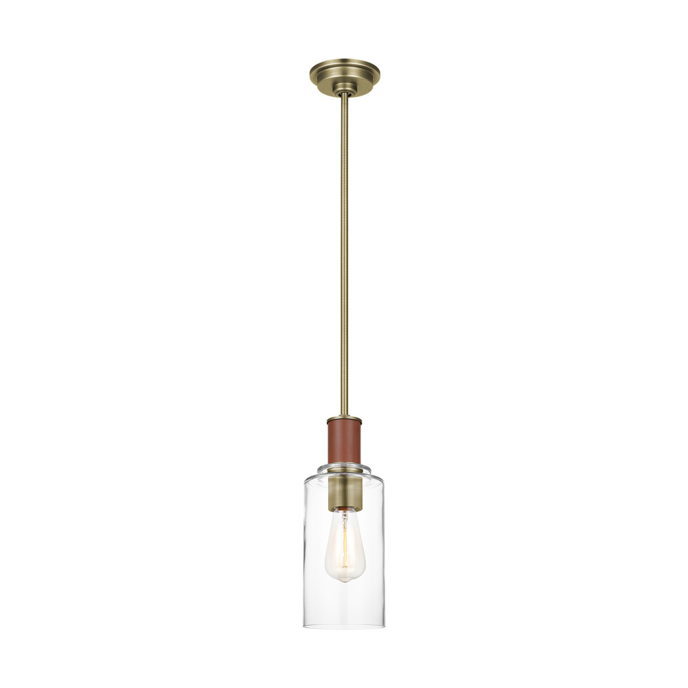 A single bulb is suspended through a clear glass shade and accented with a saddle leather band.