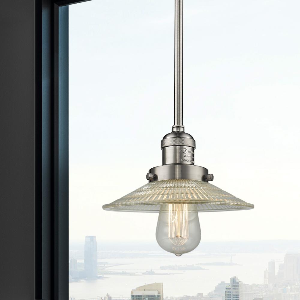 Halophane - 1 Light - 9 inch - Brushed Satin Nickel - Clear Halophane Shade - Stem Hung - Mini Pendant