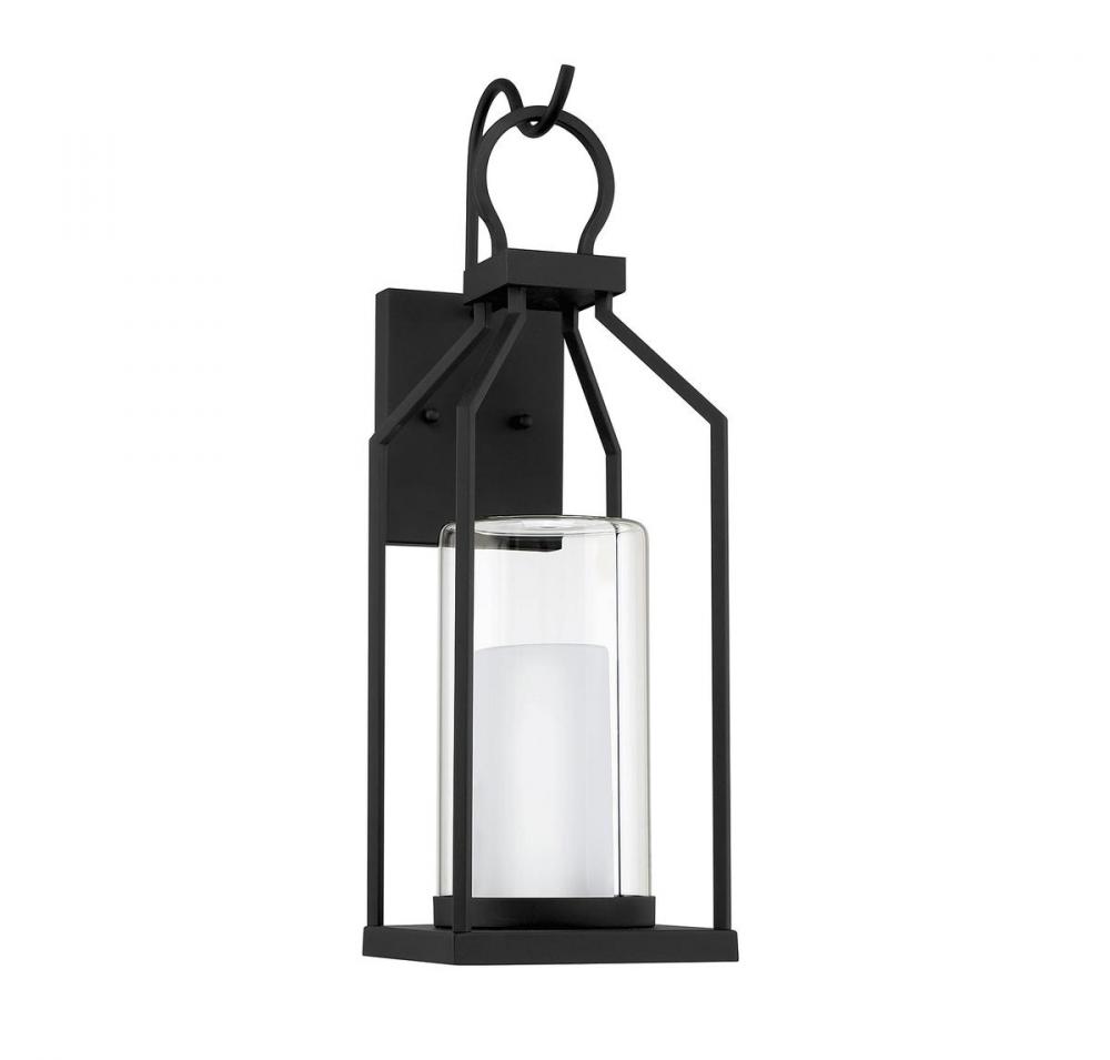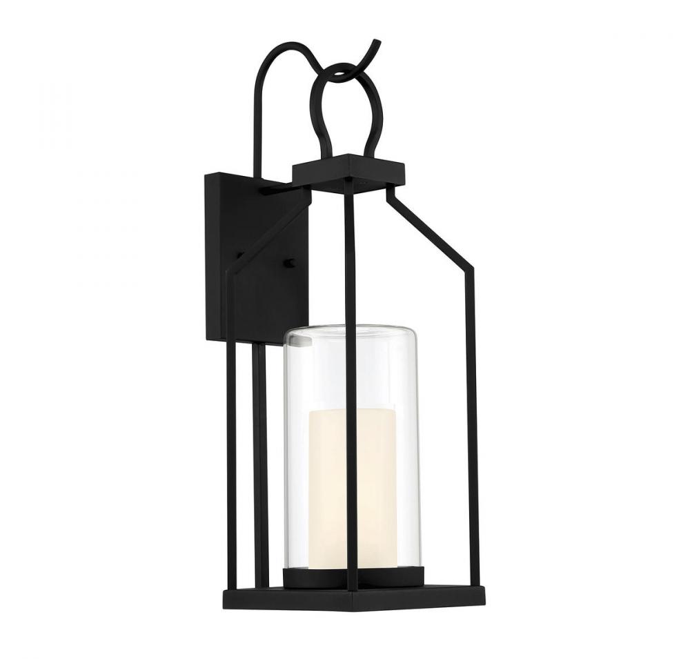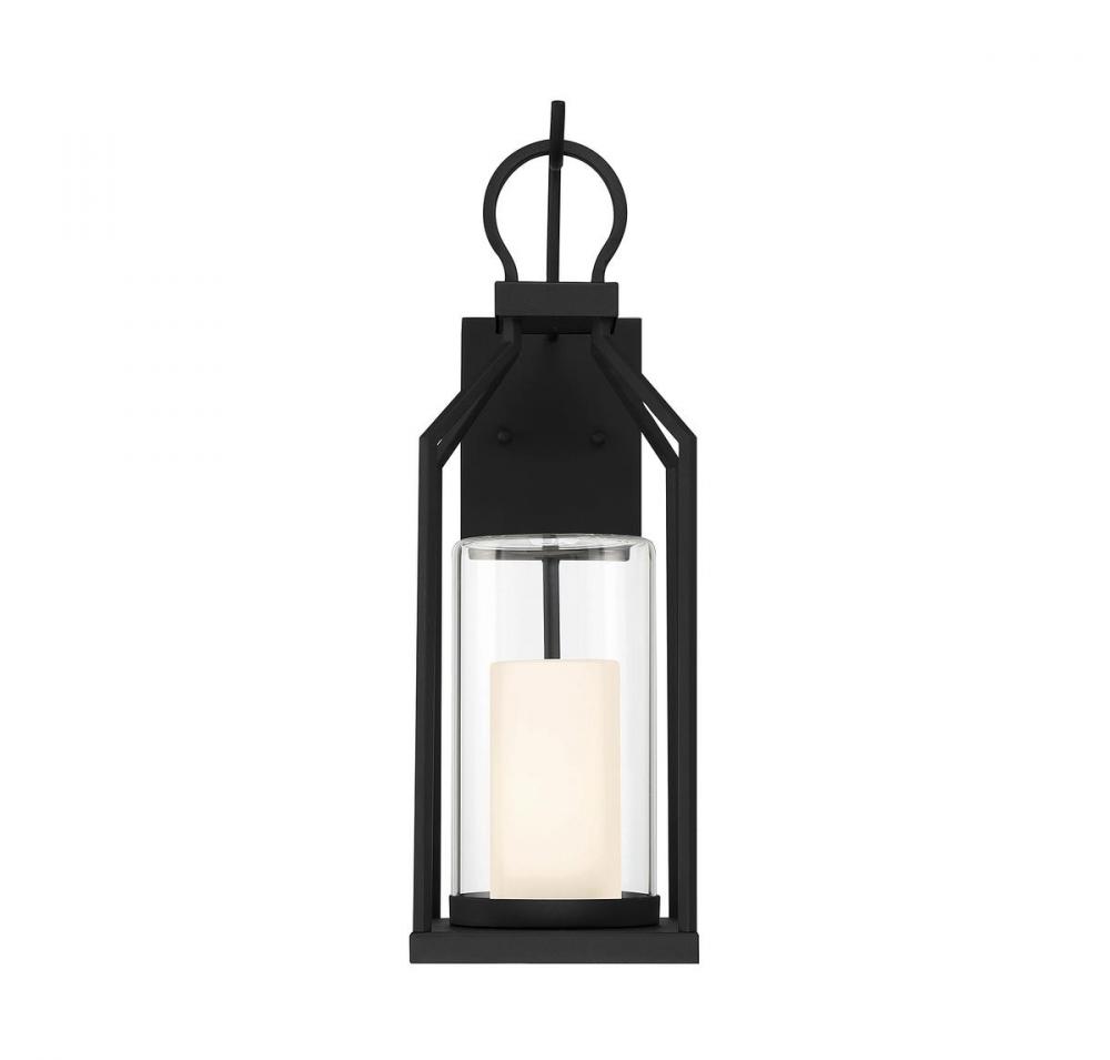 Light the way home with the lantern-inspired style of the Savoy House Hamilton 1-light outdoor wall light. A white opal glass shade, held within a protective clear glass shade, recalls the look of candlelight. The matte black finish makes Hamilton a great choice for lighting a wide variety of homes. Hamilton is 23.5" in height, 7.5" in width and extends 9.5" from the wall. It uses one candelabra size bulb of up to 60 watts per bulb. Wet area rated.