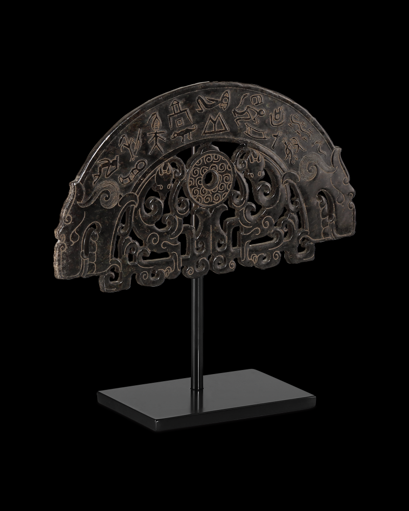 The Han Dynasty Jade Jewel, which is made of a bronze-colored stoneware, emulates a famed jade carving and sits atop a metal stand in a black finish. The profile represents how important jewels were to women during the great Chinese dynasties; this particular piece worn on the chest. The name of this rich brown sculpture reflects that it is made in a Han Dynasty style, and it is carved on the front and the back.