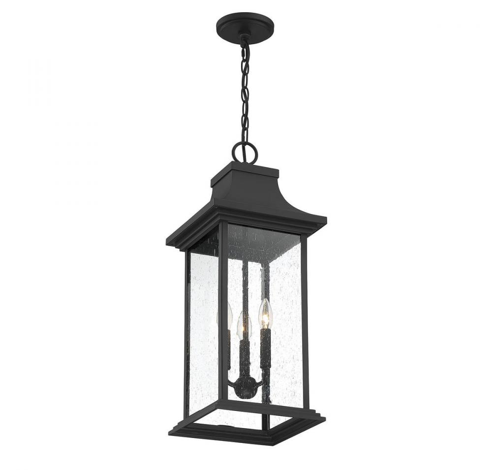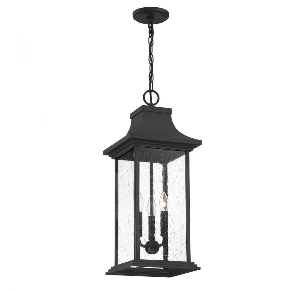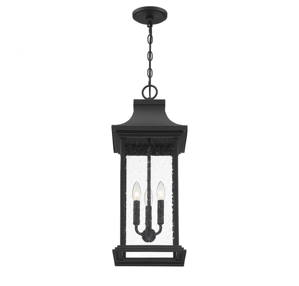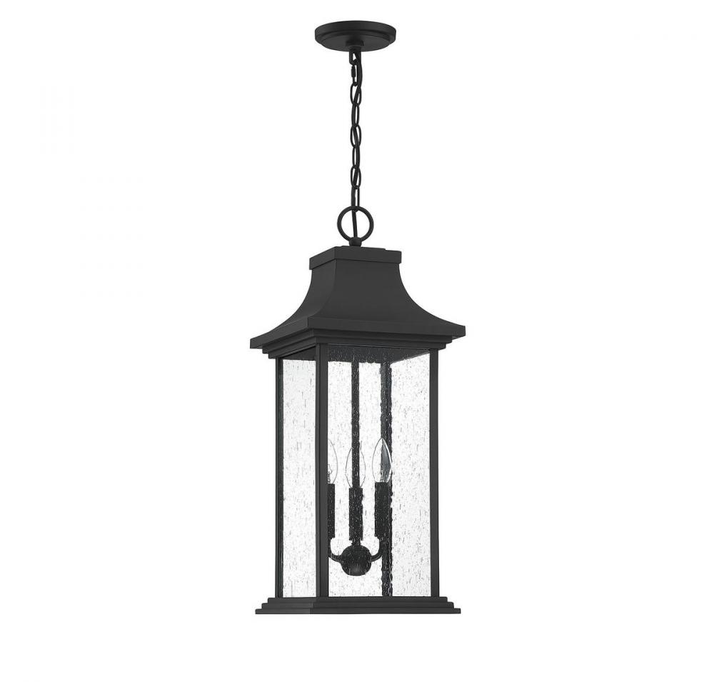 Create a stylish first impression outside your home with this Savoy House Hancock 3-light outdoor hanging lantern.Crafted in a timeless classic style, it features a boldly sloped roof, a large circular chain link and panes of clear seeded glass that ensures a beautiful, dramatic glow. The versatile black finish means that Hancock goes well with anything. Use this lantern above your front door or in a covered area like a porch or patio. This fixture is 10.5" wide and 25" tall. Uses 3 candelabra size bulbs of up to 40 watts each (not included).
