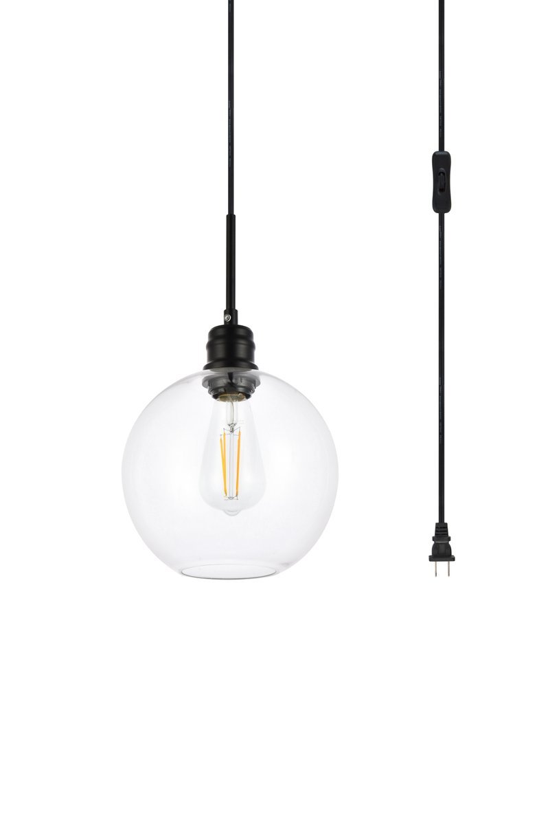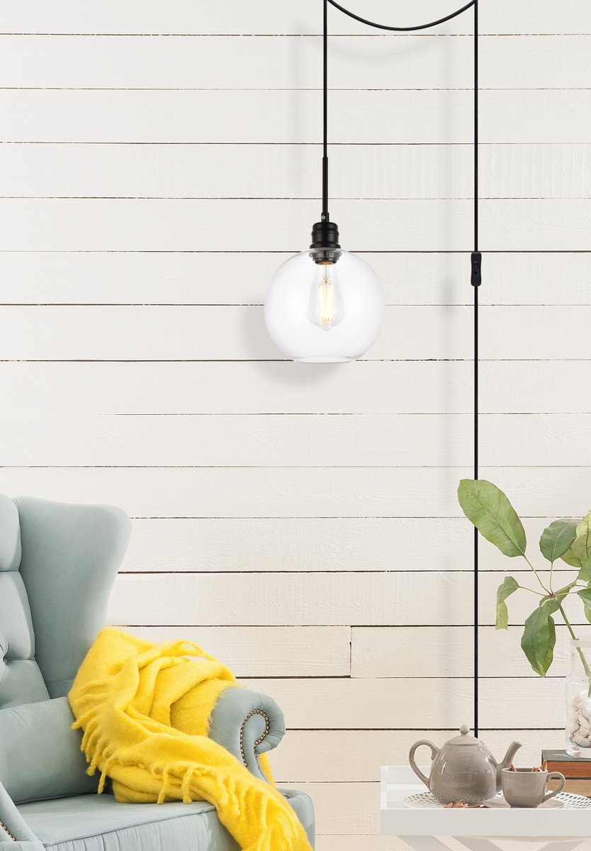 Clean lines and modern whimsy--that's the Emett Collection of plug in pendant lamps. Its Single light makes it perfect for any small apartment or room space, but its also a perfect addition to any larger rooms that requires illumination, such as a dining room or living room. Available in a black or brass finish with a round clear glass shade, it won't be too hard to fit this versatile lighting fixture in your home (light bulbs not included). Comes with a 15 foot cord with an in-line on and off switch. Also includes two swag hooks. Simply hang this piece on the provided swag hooks and plug it in for an effortlessly easy installation - can be hung from a sloped or vaulted ceiling.