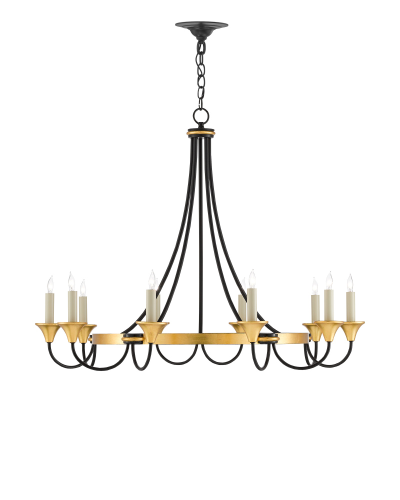 A graceful rendition of a classic chandelier shape, our Hanlon Chandelier will bring lovely illumination to traditional or transitional spaces. One of its strongest stylistic successes is the intermingling of matte and gleaming finishes. The ribs of metal curving from a simple crown have been treated to a washed black finish, while the bottom band, cup-like bobeches and thin ring around the crown are luminous in a contemporary gold finish.