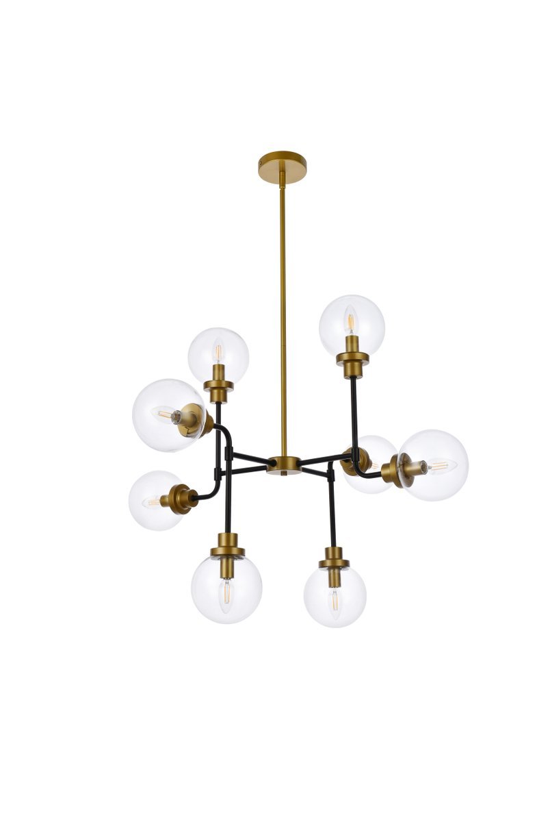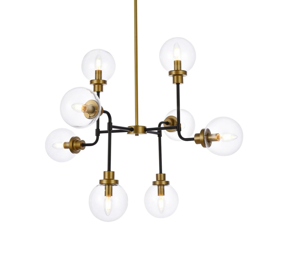 Hanson 8 lights pendant in black with brass with clear shade is the perfect fixture for over a kitchen island, over a dining table, or use in any room to make a big statement. This pendant elevates the look of any space.
