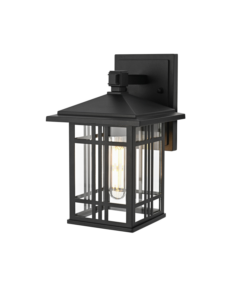 The square backplate provides a stable mount while complementing the lantern’s structured design.