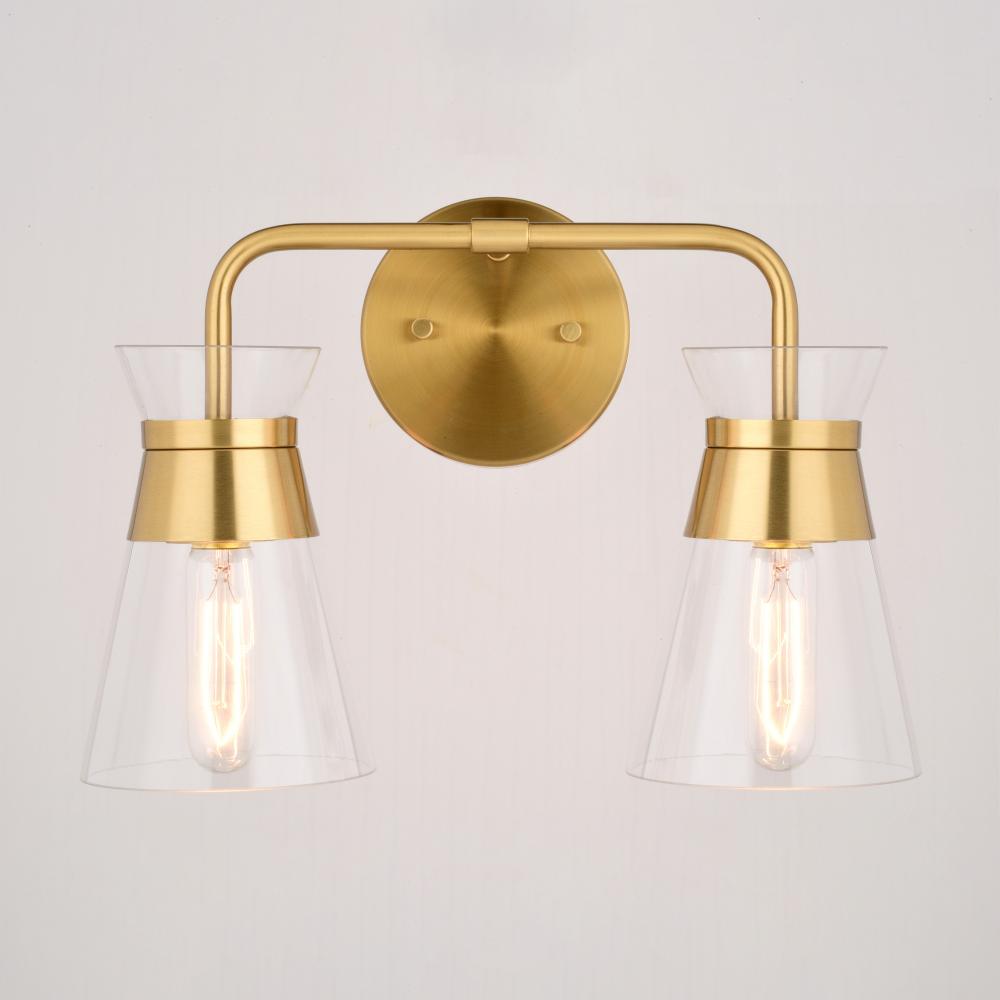 Indulge in mid-century modern charm with the Harper 2-Light Vanity. Its sleek, bowtie-inspired design and natural brass finish bring a touch of warmth and sophistication to your bathroom or perhaps even your kitchen. The clear glass shade beautifully showcases your choice of bulb, creating a captivating focal point.