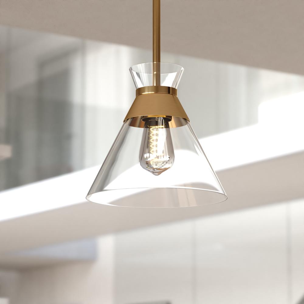 Indulge in mid-century modern charm with the Harper 1 Light Pendant. Its sleek, bowtie-inspired design and natural brass finish bring a touch of warmth and sophistication to your kitchen island or eat-in space. The clear glass shade beautifully showcases your choice of bulb, creating a captivating focal point.