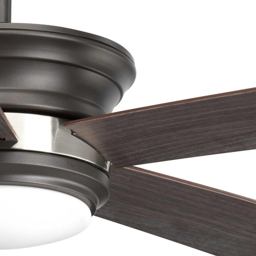 Five-blade 54" Harranvale ceiling fan features an LED light source, offering both form and function with energy- and cost-savings benefits;Features Graphite/American Walnut reversible blades;Harranvale ceiling fan with Graphite finish and Brushed Nicke