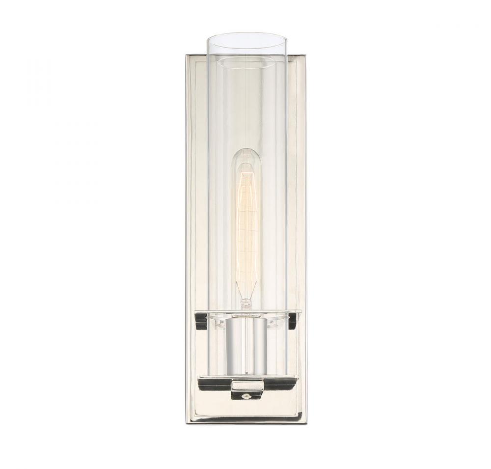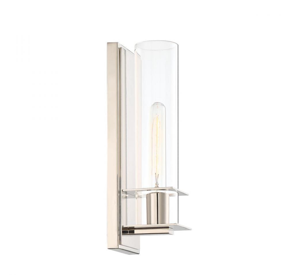 A contemporary marvel! The Savoy House Hartford 1-light sconce is a modern design delight with sleek geometric lines, a slender shade of clear glass and a high-quality polished nickel finish. One 60W standard size bulb provides excellent light and using an Edison bulb will maximize the high style. At 4.5” wide and 14” high, it’s the ideal size to bring contemporary, stylish elegance to your dining area, living room, kitchen, entryway, bedroom, great room, hallway, office or media room.
