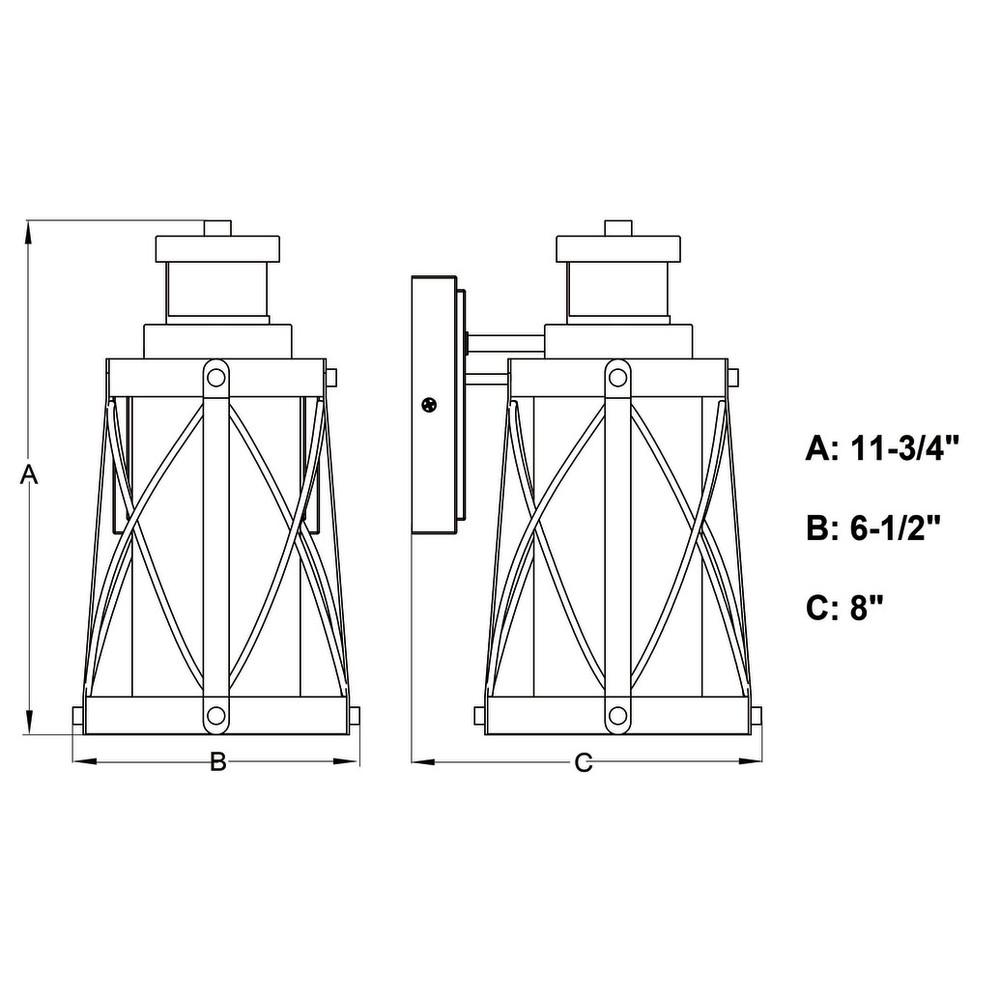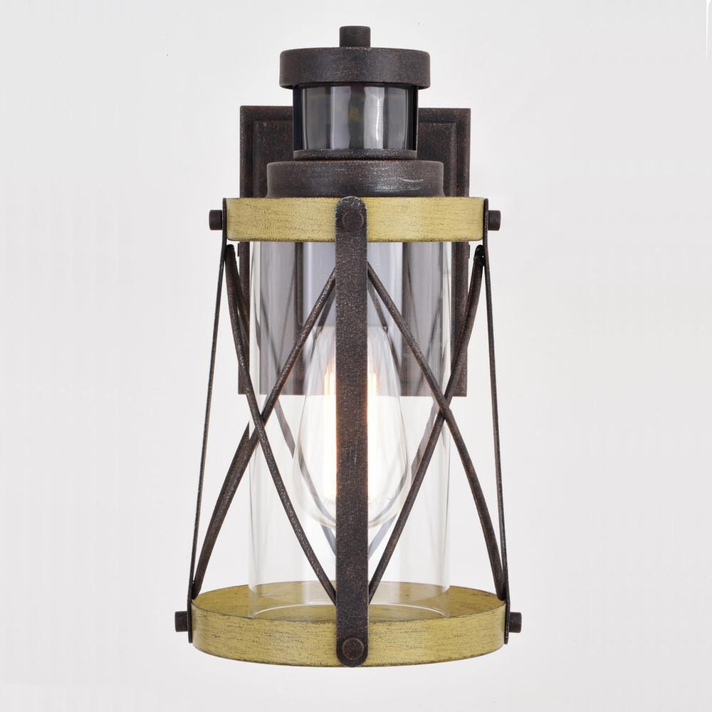 Warmth and charm come together in this farmhouse collection called Harwood. Finishes of oxidized iron and burnished elm enhance the lantern-like shape in the most unique way. A transparent glass shade resides inside the tapered frame, while slim black lines create a touch of geometry. This outdoor wall light is ideal for your covered porch, entryway, garage, or any other area of your home. Dualux patented dual-level security lighting is outdoor lighting made smarter - brighter light at dusk, dimmer at night, brightening instantly when it detects motion. Designed to reliably and effortlessly enhance your home’s beauty, security and efficiency from dusk to dawn with its built in motion sensor and photocell. This fixture works with any dimmable incandescent or halogen bulb and most dimmable LED bulb models. This decorative outdoor security light is designed to enhance the beauty, safety, and efficiency of your home.