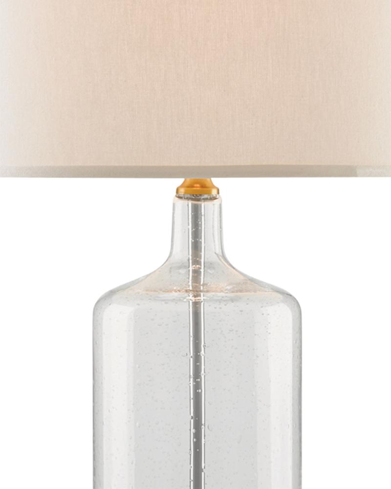 The Hazel Table Lamp with its bottle-shaped body in a marvelous clear seeded glass has a metal base, hardware, and finial in a gleaming brass finish. These add a touch of warmth to the design, as does the off-white shade on the clear glass lamp.