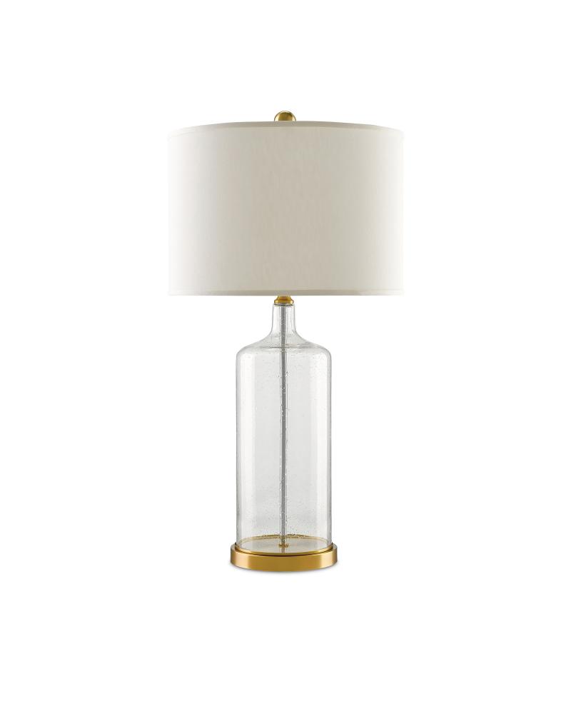 The Hazel Table Lamp with its bottle-shaped body in a marvelous clear seeded glass is the perfect manifestation of tiny bubbles! The metal base, hardware and finial have been treated to a gleaming brass finish to add a touch of warmth to the design. The off-white shade on the lamp that stands 31 inches tall completes a composition of perfect proportions.