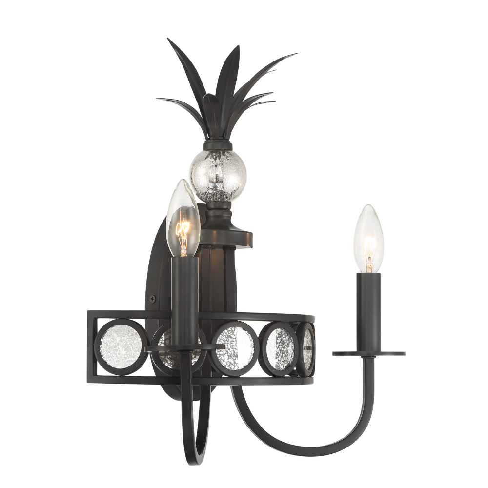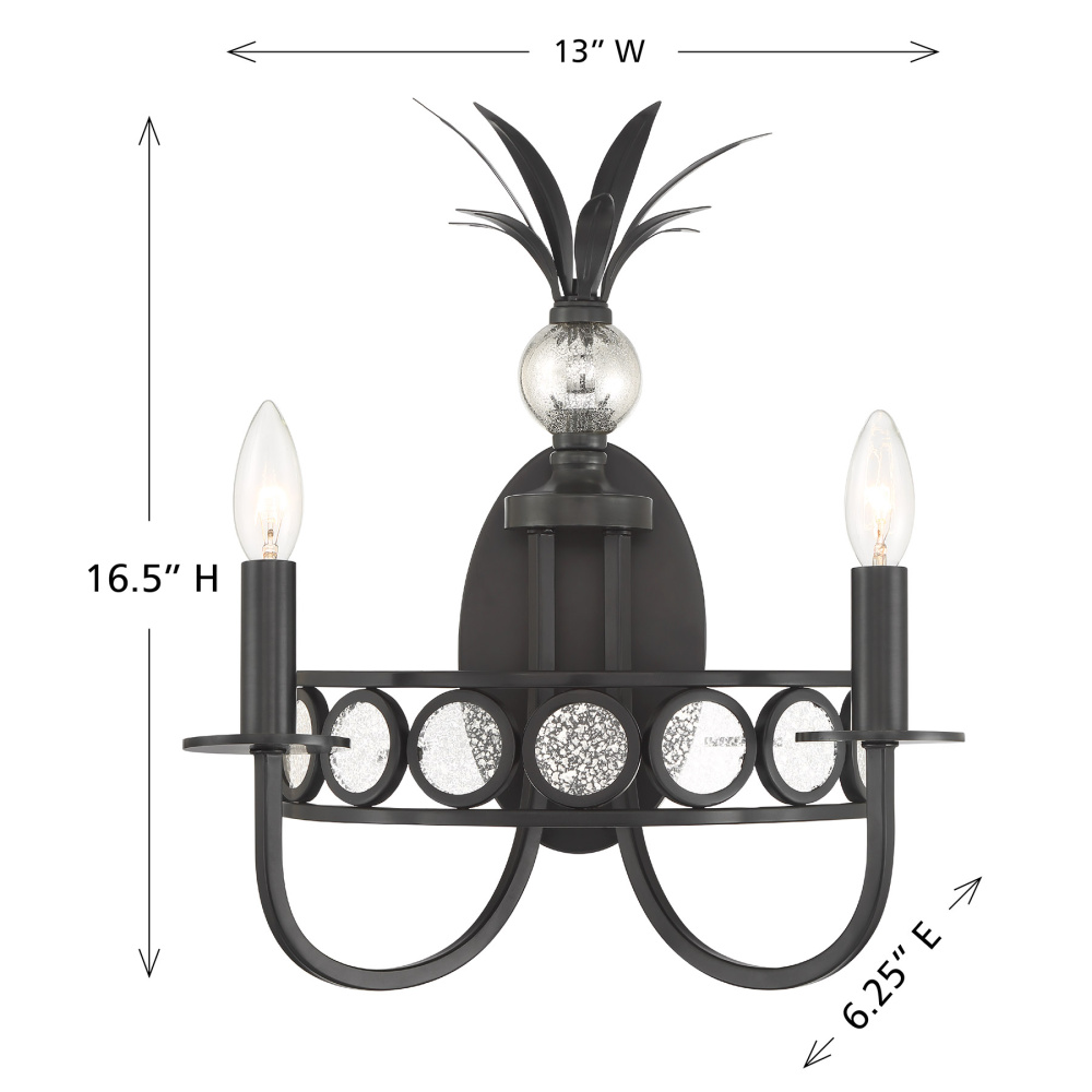 The Savoy House Hearst 2-light sconce is a timeless and elegant design adorned with intriguing details. Discs of antique glass bring in a big dose of textural intrigue while a crown of tall leaves at the top of the fixture imparts a welcoming feeling. The bold Black Tourmaline finish makes this sconce perfectly suited for illuminating any space. Hearst is 16.5" in height, 13" in width and extends 6.25" from the wall. It uses two candelabra size bulbs of up to 60 watts per bulb. Bulbs not included.
