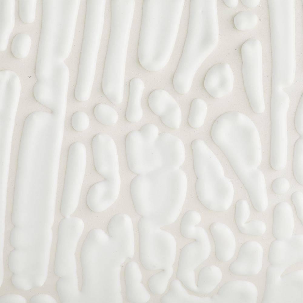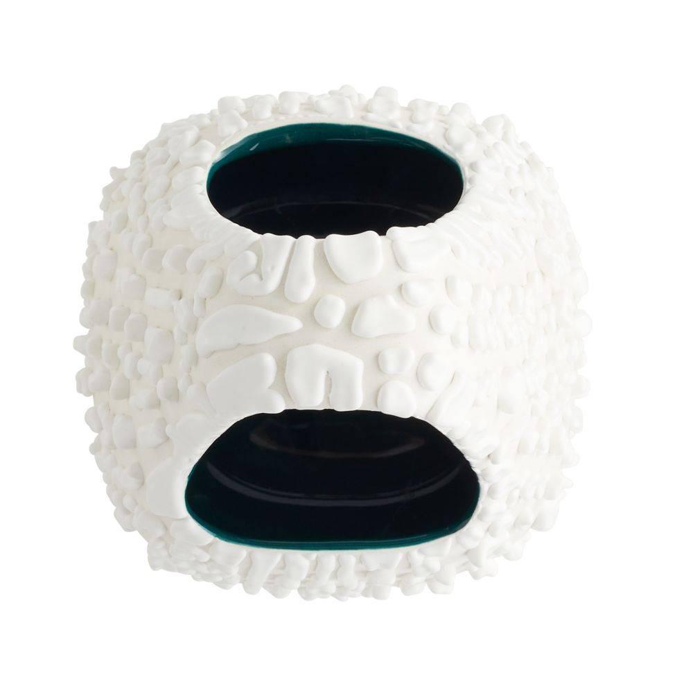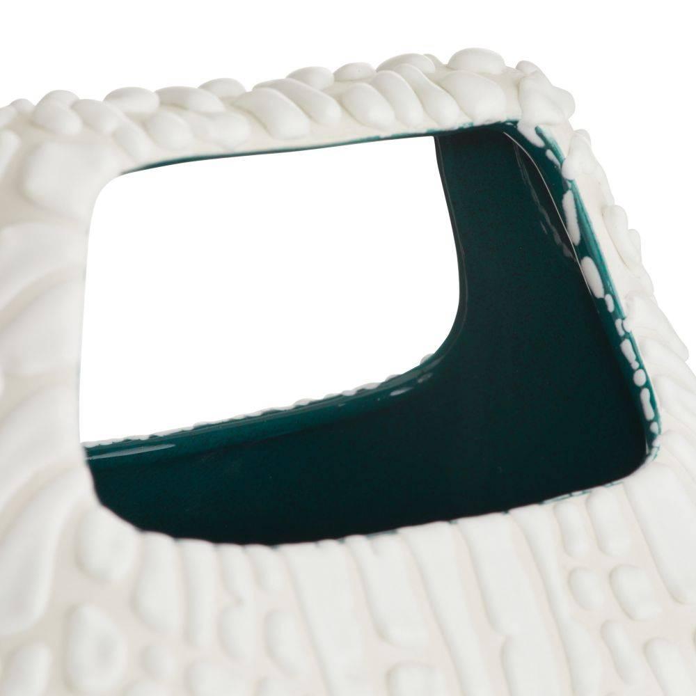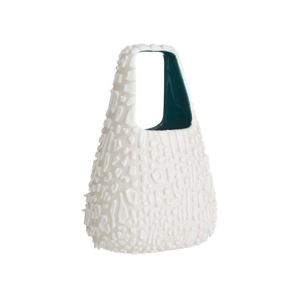 A trio of hyper-textured porcelain vases were designed to resemble handbags or baskets, complete with built-in handles. Glazed in a vanilla foam finish, they are finished with a 3-D drip effect on the exterior while the interior is finished in a sea green glaze. Finish will vary.