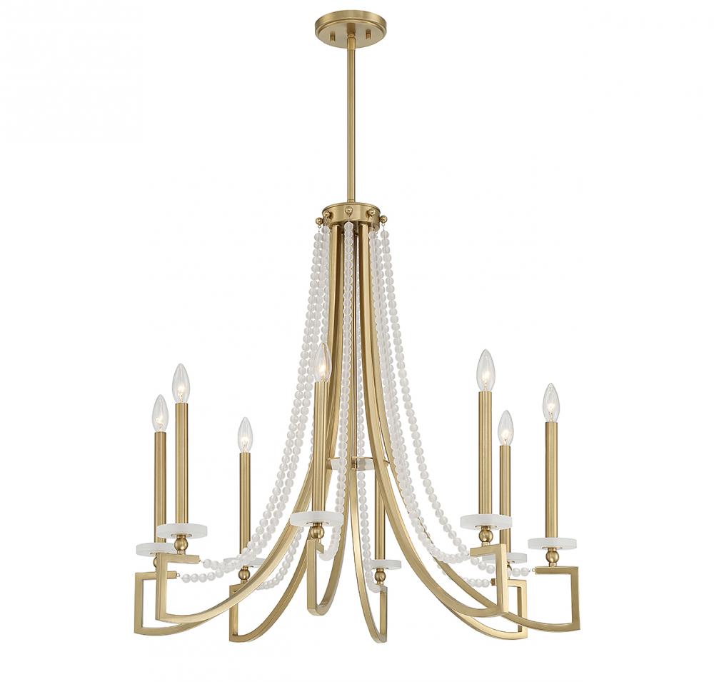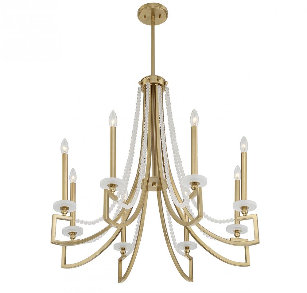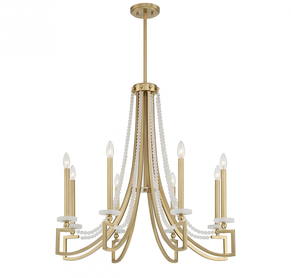 Featuring elegant strands of frosted beads and matching frosted bobeches, the Savoy House Helen 8-light chandelier adds a touch of classy style to the home. Warm brass finish. Helen is 31.75" in height and 32" in width. Comes with four 12" downrods and one 6" downrod. Uses 8 candelabra bulbs with a max of 60 watts per bulb (bulbs not included).