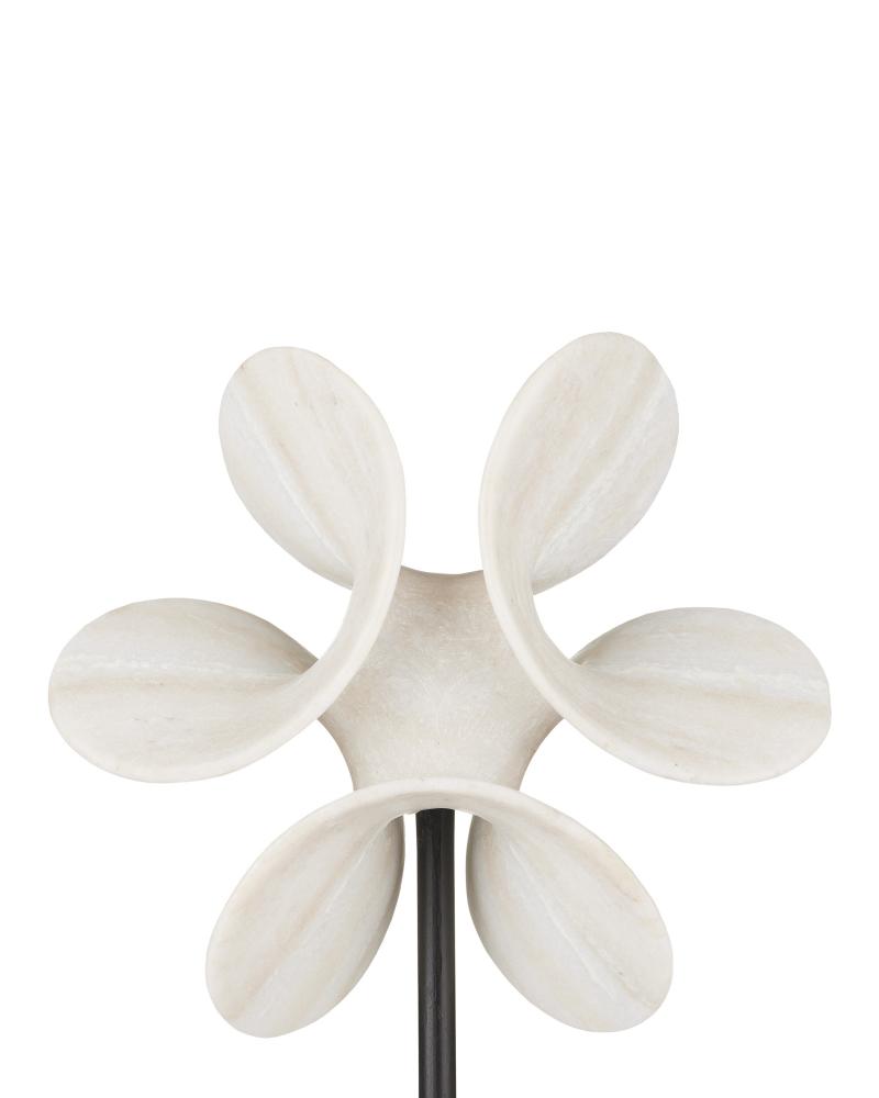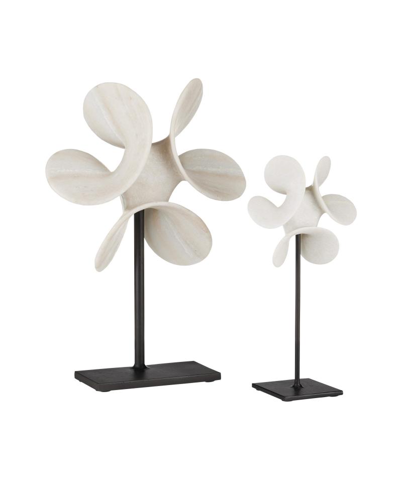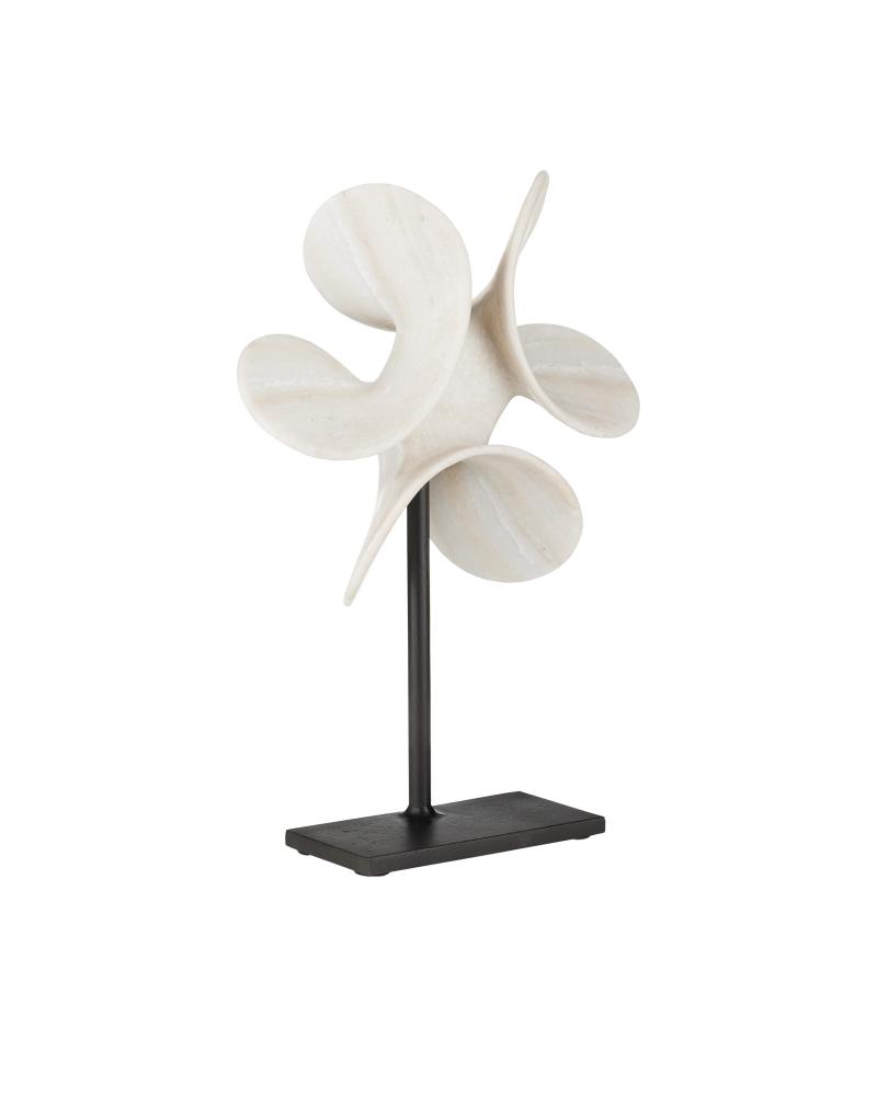 The propeller shape of the Helice Large Marble Ring will be a dynamic presence in a space; the white sculpture a feat only an accomplished stone carver could create. The flowing lines as they reach the bottom of the piece envelope the black metal stem to which it is attached. The stem and the base are pared down, adding a nice contrast tonally and structurally. Because the Helice is carved from natural marble, each sculpture will vary slightly.