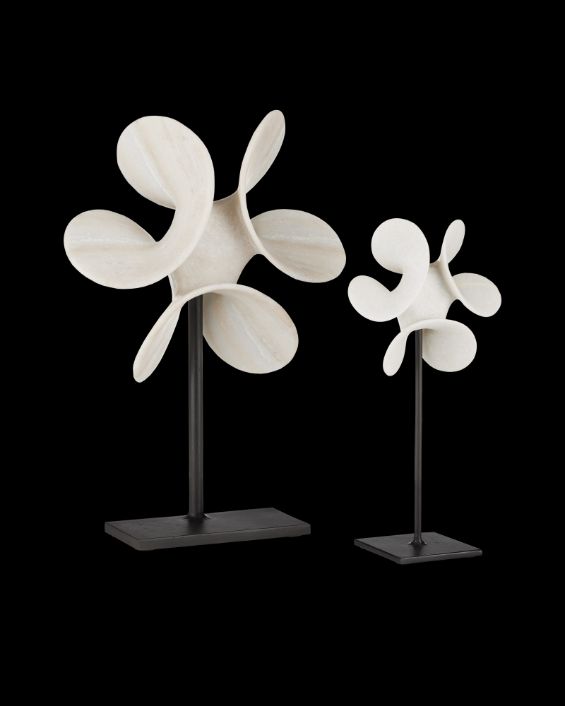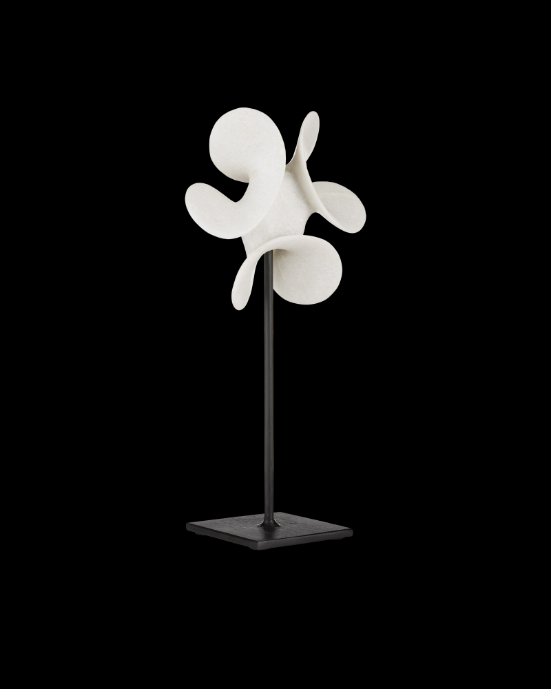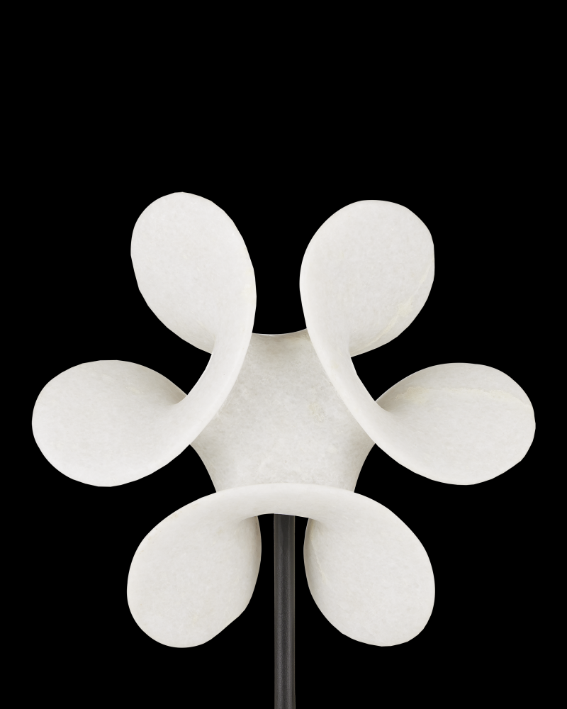 The propeller shape of the Helice Small Marble Ring will be a dynamic presence in a space; the white sculpture a feat only an accomplished stone carver could create. The flowing lines as they reach the bottom of the piece envelope the black metal stem to which it is attached. The stem and the base are pared down, adding a nice contrast tonally and structurally. Because the Helice is carved from natural marble, each sculpture will vary slightly.