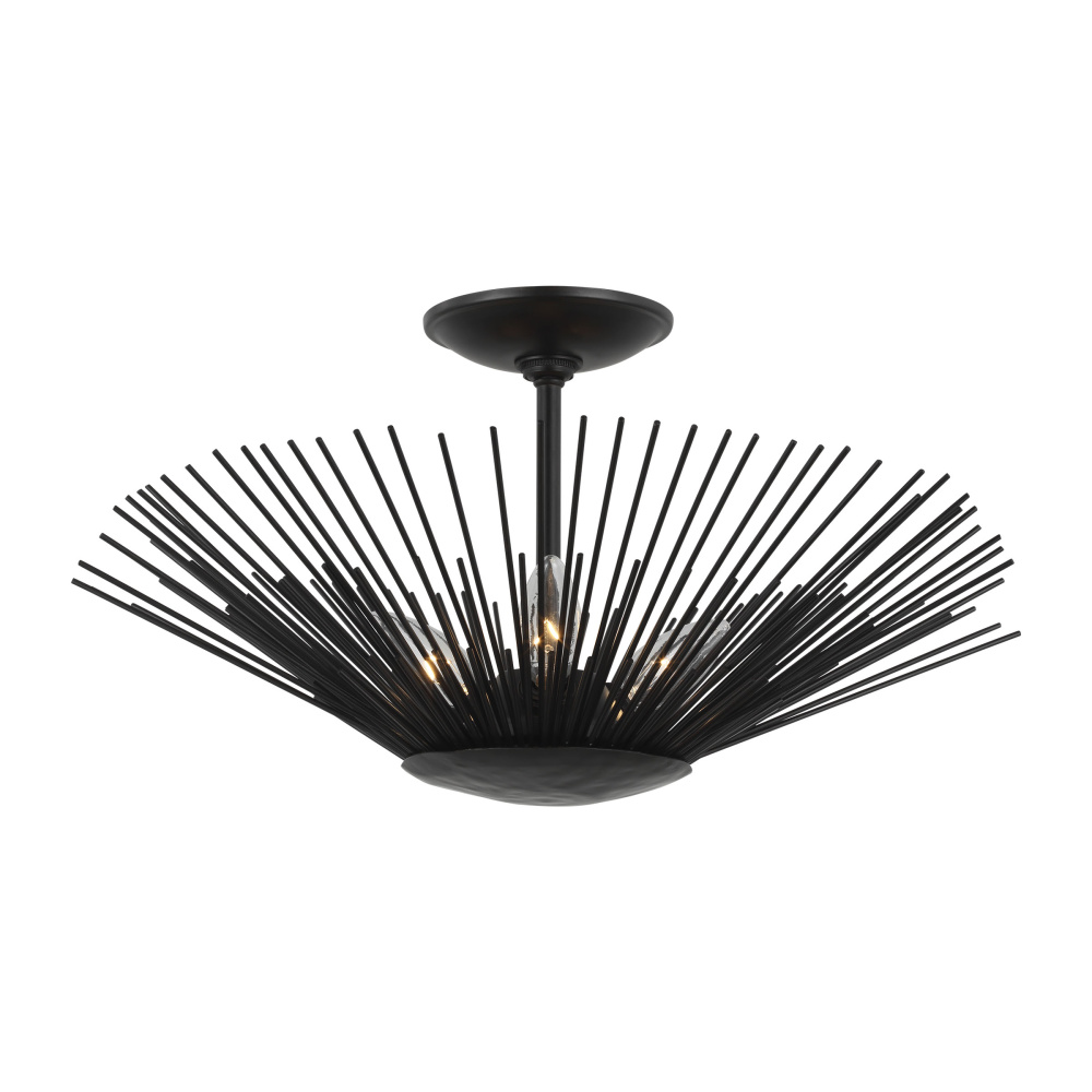 Named after the Greek God of the Sun, the Alexa Hampton Helios series is made with hand-applied gold leaf and then hand-distressed. This Mid-Century Modern fixture takes the shape of its name, with up-flowing stems resting elegantly on a round metal canopy. Straw-like brass layers of hand-cut, hand-welded metal rods form the shade of this textural fixture. The Helios series features a dynamically cut, sun-like form and gilded iron finish. This stunning piece is an eruption of light and brings a stylish presence to any aspect of your space. The assortment included fresh takes on traditional looks, beautiful and unique hand-applied finishes, and stunning, thoughtful-inspired sculptures.