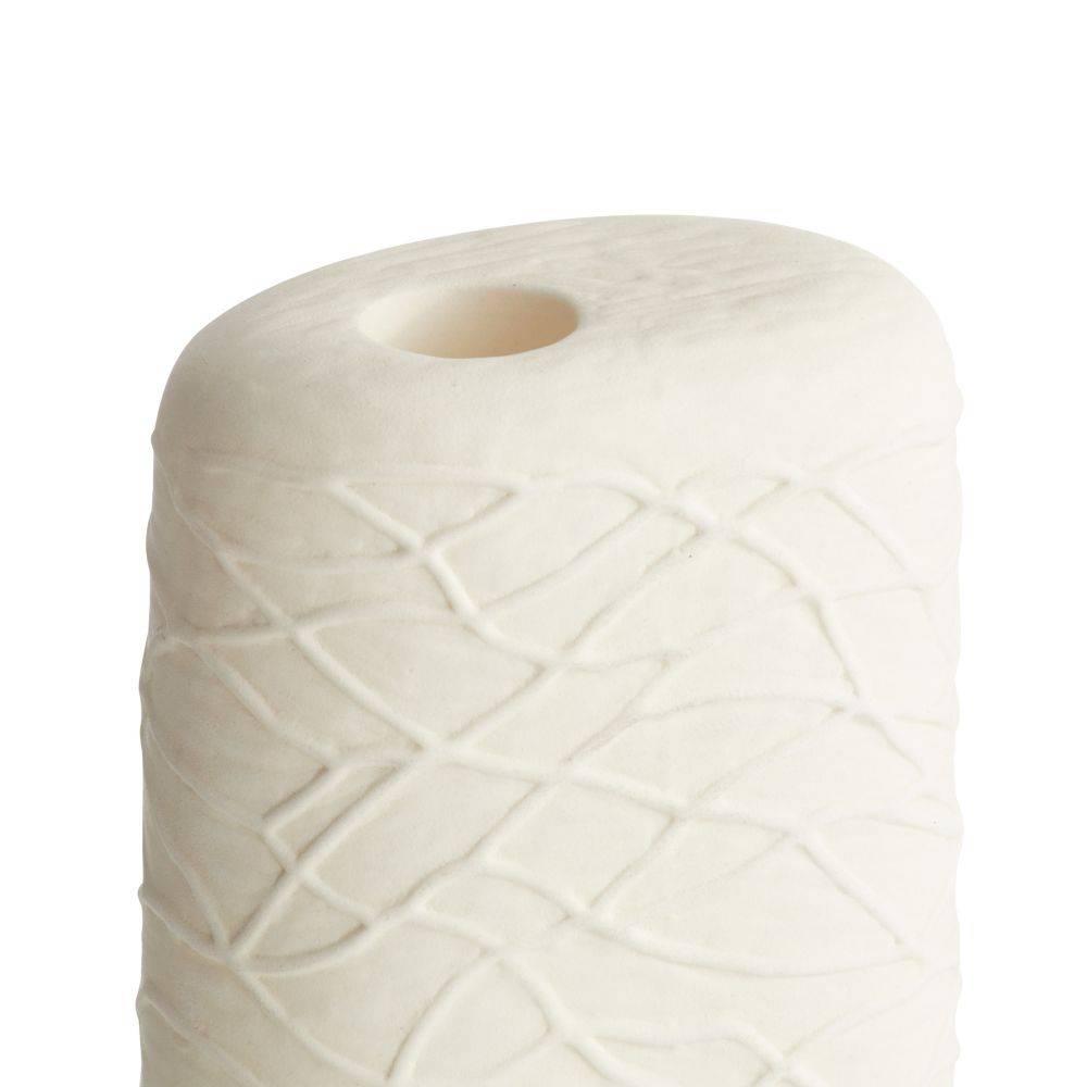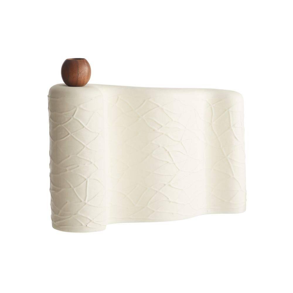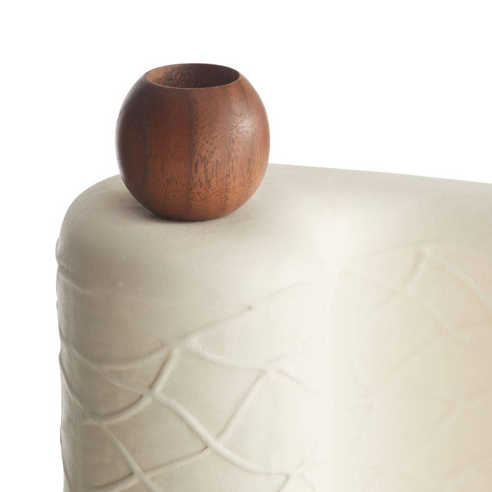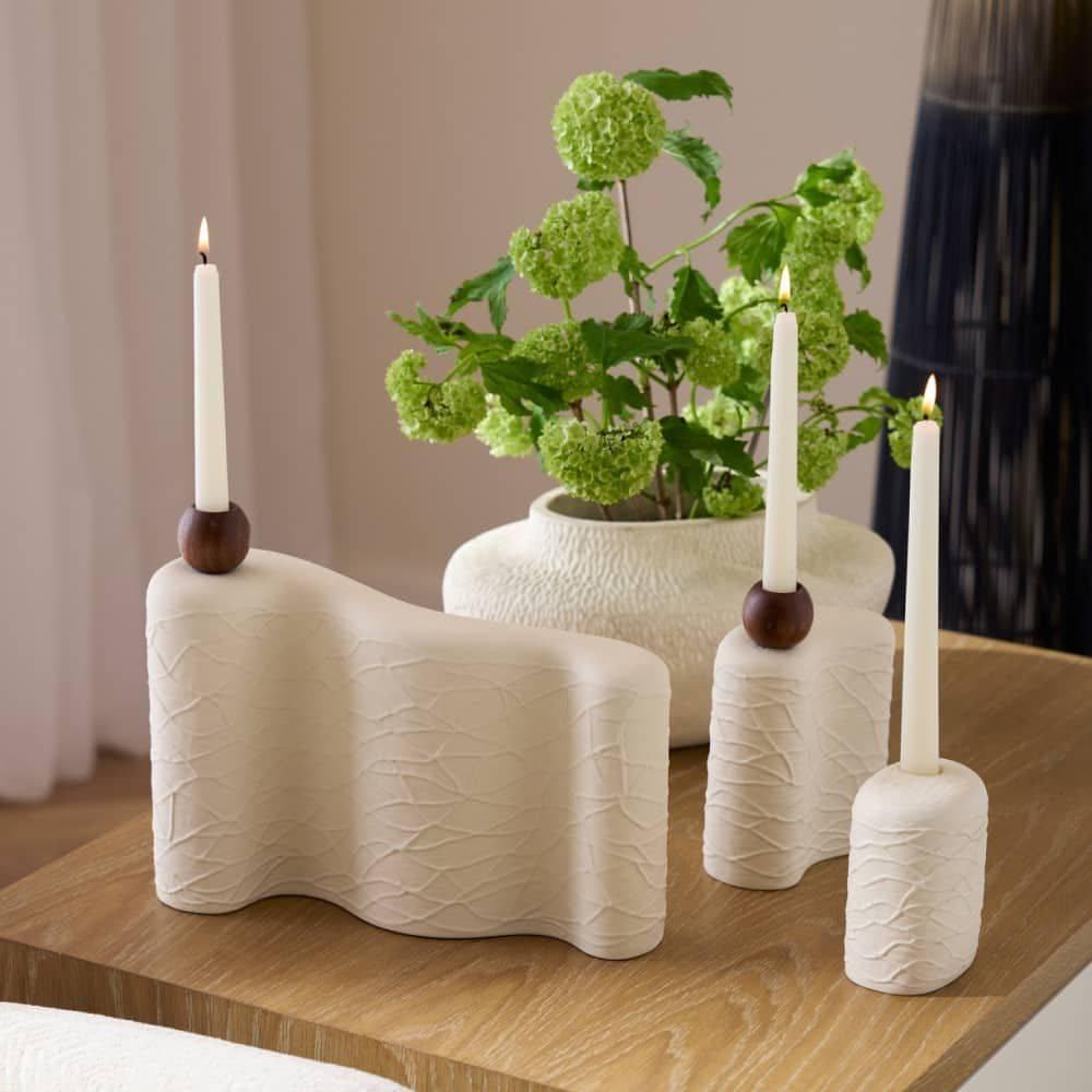 Our candleholders were designed to be nested or pulled apart to create a unique vignette. Crafted of porcelain with a matte eggshell glaze, each has a texture inspired by embroidered fabric. Walnut wood accents add an organic feel. Finish will vary.