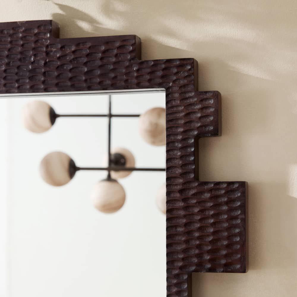 Energizing, rhythmic patterns elevate our Hewitt mirror. Inspired by puzzles and notching, a black cherry-finished mango wood frame is crafted with a dramatic, hand-carved texture. Designed to be hung vertically or horizontally, it is secured with a cleat attachment for hanging. Finish will vary.
