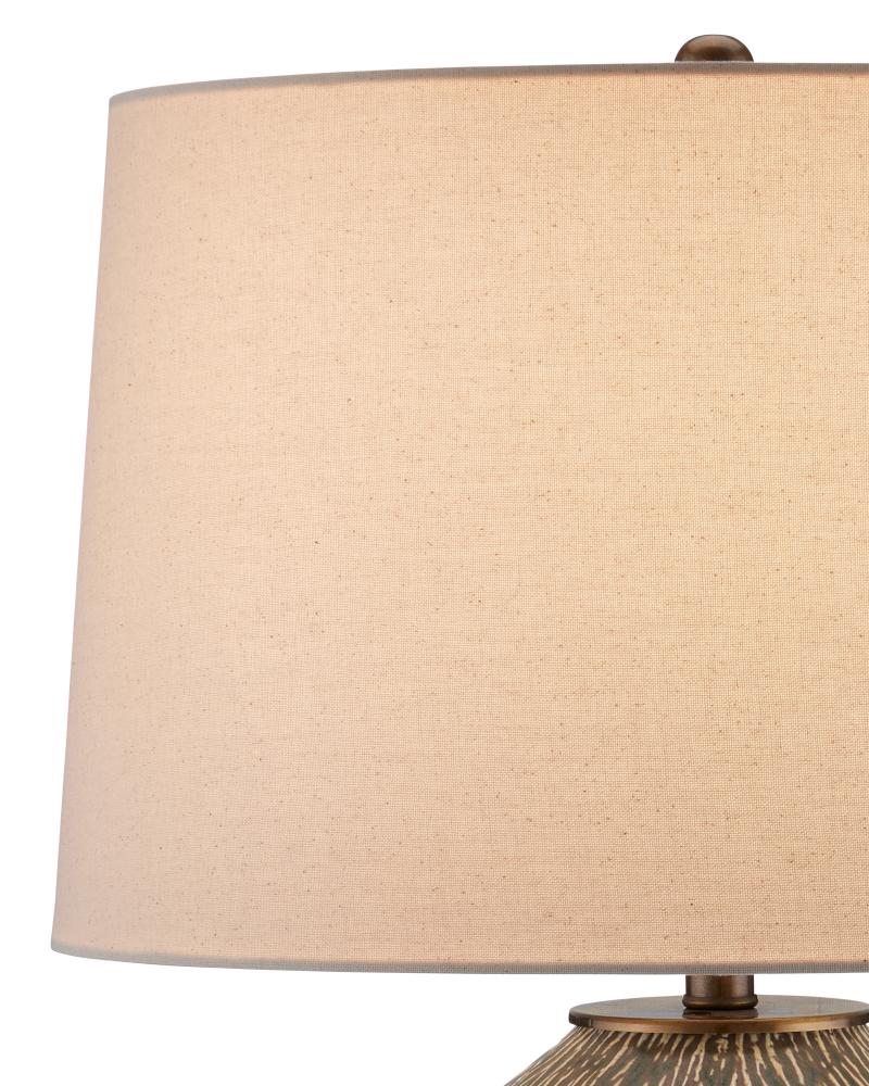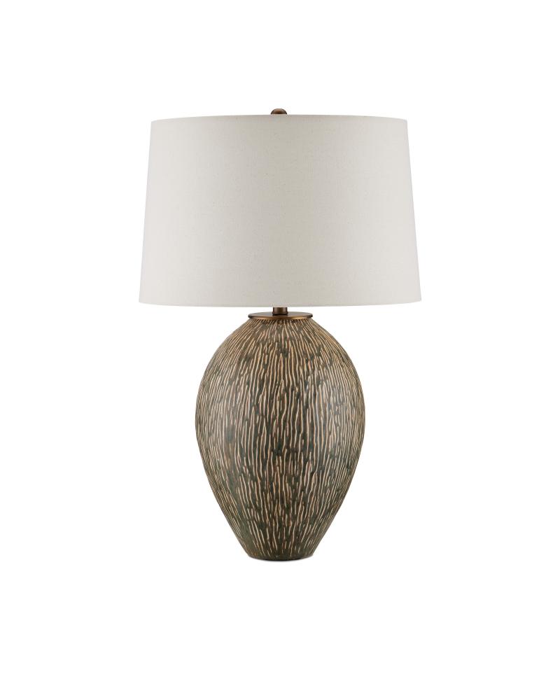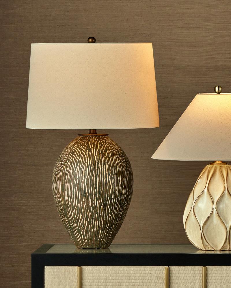 The Hildreth Table Lamp is awash in a textural pattern in an olive green and beige color combination. Made of porcelain, the dark green lamp gains a sense of movement from the flowing lines that ornament its surface. The fact it culminates without a base, and has an antique brass finish on the hardware and finial brings this composition great warmth.
