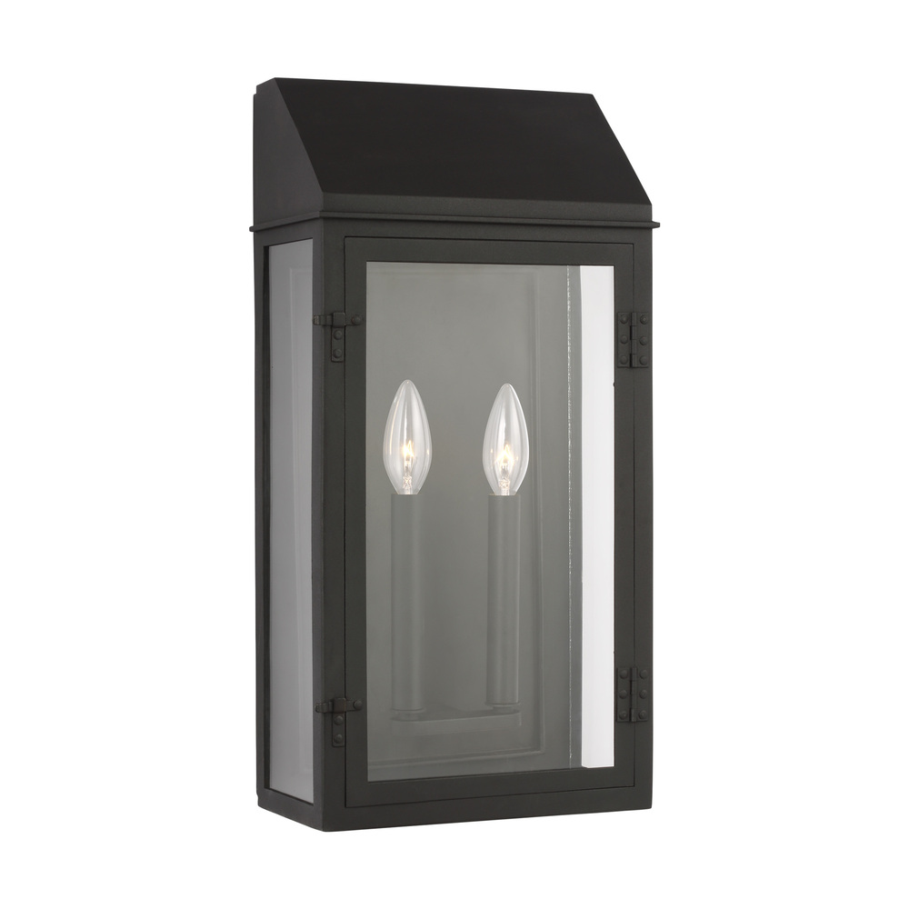 The Hingham outdoor family by Chapman & Myers is crafted of steel with a clear glass front, textured black finish and black candle tubes. Available in three size options .