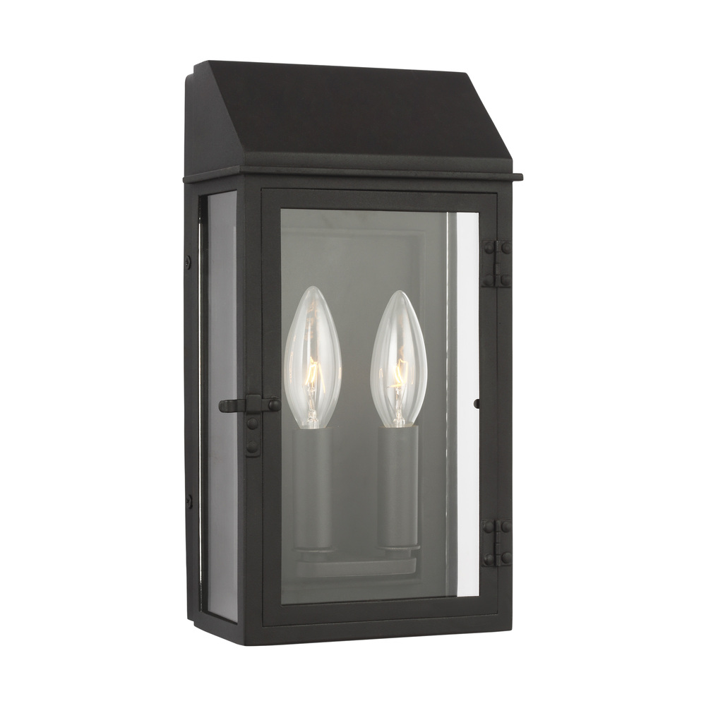 The Hingham outdoor family by Chapman & Myers is crafted of steel with a clear glass front, textured black finish and black candle tubes. Available in three size options .