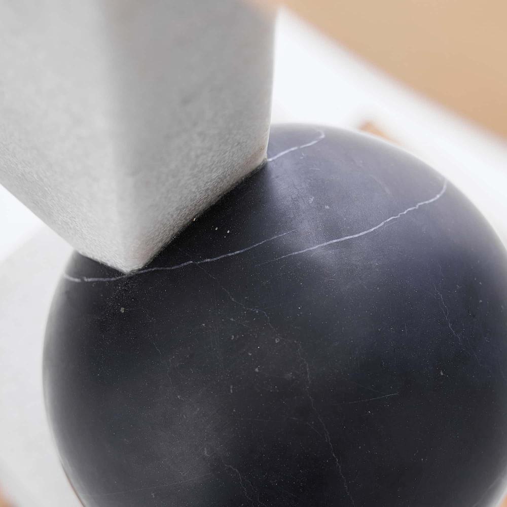 THIS MODERN SCULPTURE NODS TO THE GEOMETRY FOUND IN CUBIST ART. SHOWCASING A RICH, CONTRASTING MIX OF MATERIALS, THE HIROSHI FLOOR SCULPTURE BALANCES ANTIQUE BRASS AND IVORY RICESTONE COMPOSITE HALF-MOON SHAPES AGAINST A BLACK MARBLE SPHERE AND A RICESTONE COMPOSITE PEDESTAL BASE. THIS DYNAMIC STATUE RENDERS A TRUE CONTEMPORARY ART CONVERSATION PIECE. FINISHES WILL VARY.