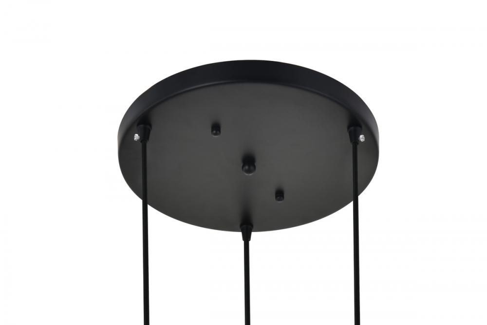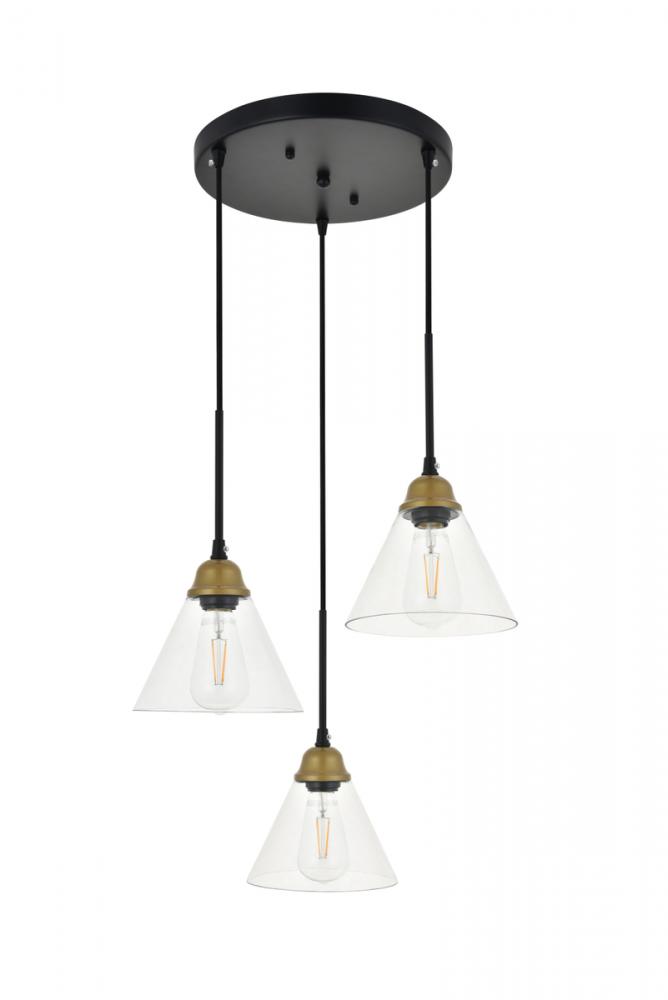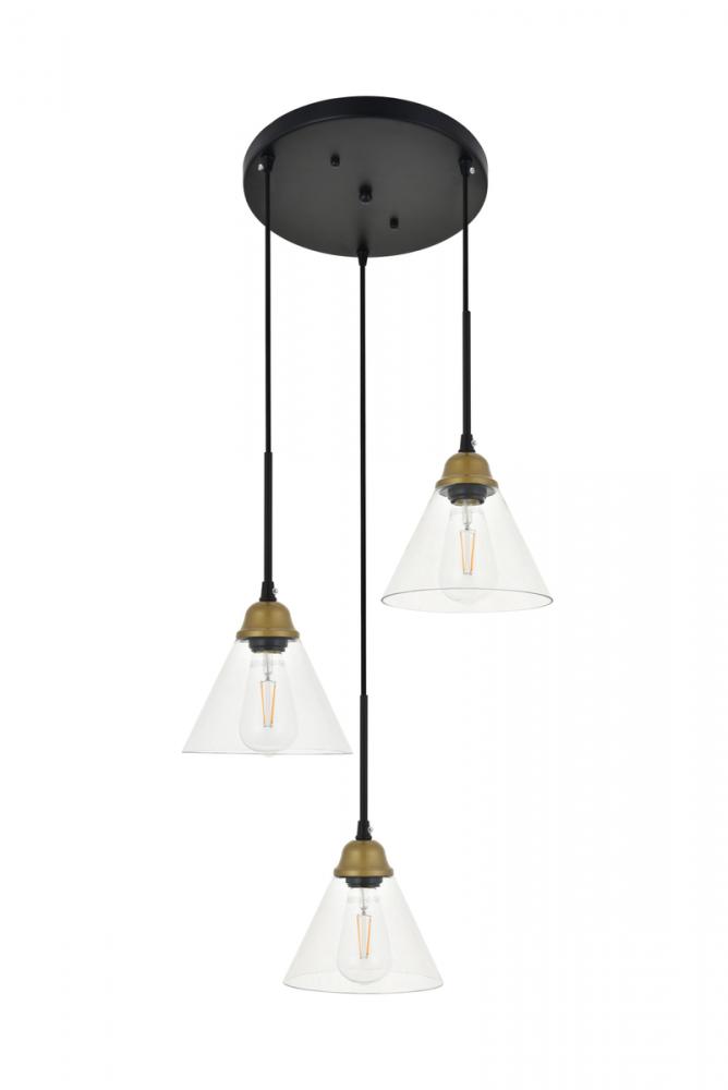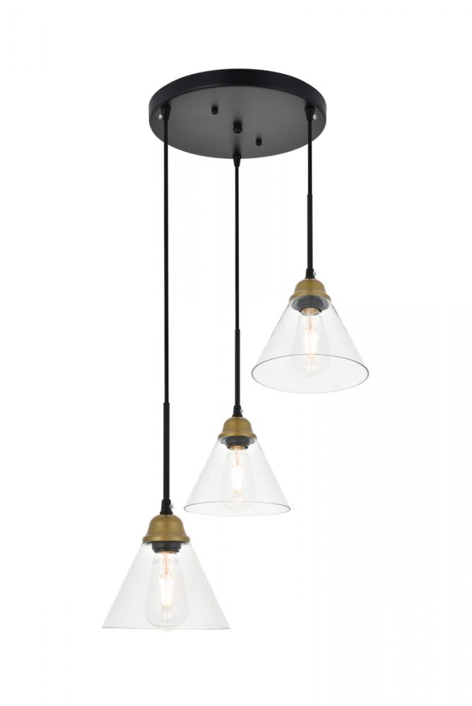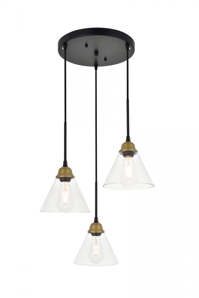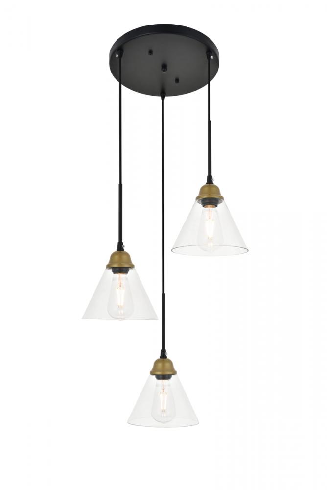 Two-toned brass and black finish 3-light pendant light with cone glass shade suspended from a circular canopy