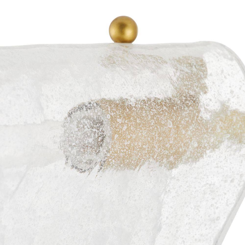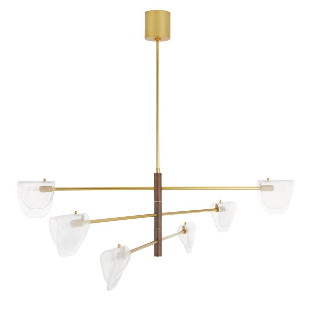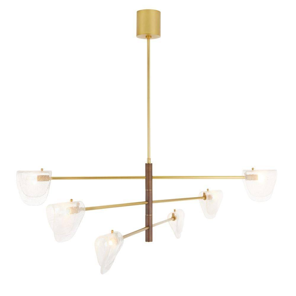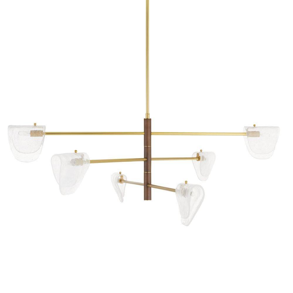 Like a modernist mobile, the arms of the Hockless pivot for optimal illumination. Inspired by balanced sculptures, every antique brass-plated steel arm ends in hand-folded shades of clear, seedy glass. Featuring an elegant center column of walnut wood and antique brass plate suspension pipe. Damp-rated, although limited covered outdoor areas may affect finish. Finish will vary.