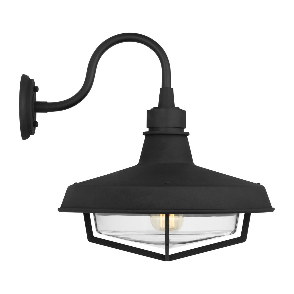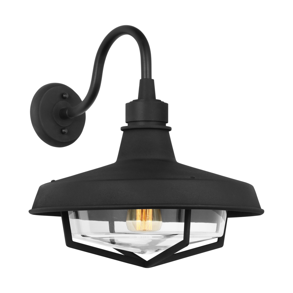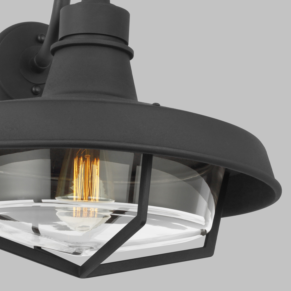 The Hollis outdoor series by Thomas O'Brien is a modern take on the classic barn light design. This gooseneck style is made with steel and has a classic black texture and vintage design, bringing a farmhouse look. The clear glass shade sits above the cage to create a modern silhouette.