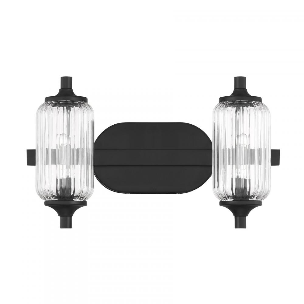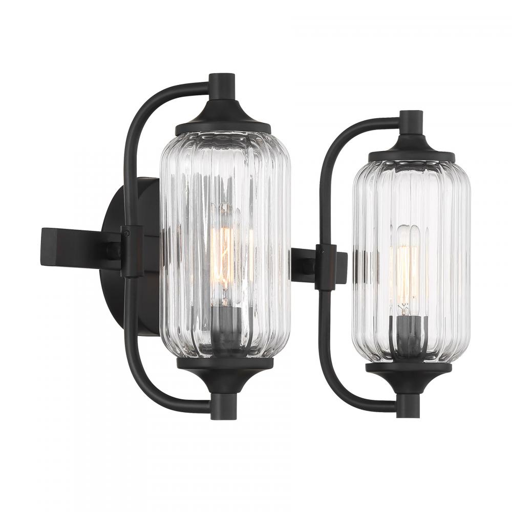 The Savoy House Holton 2-light bath light showcases an inventive and geometric style with tall, rounded shades of clear ribbed glass and a slim, rounded structure finished in Black. It will bring a big dose of style to any bathroom! Holton is 9" in height, 16" in width and extends 6.75" from the wall. It uses two candelabra size bulbs of up to 60 watts per bulb. Bulbs not included. Install as shown. This bath bar is damp area rated.