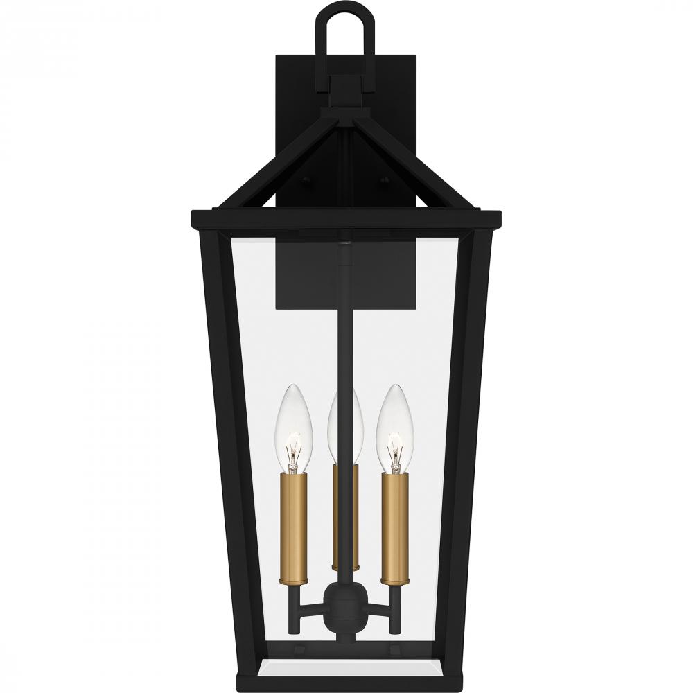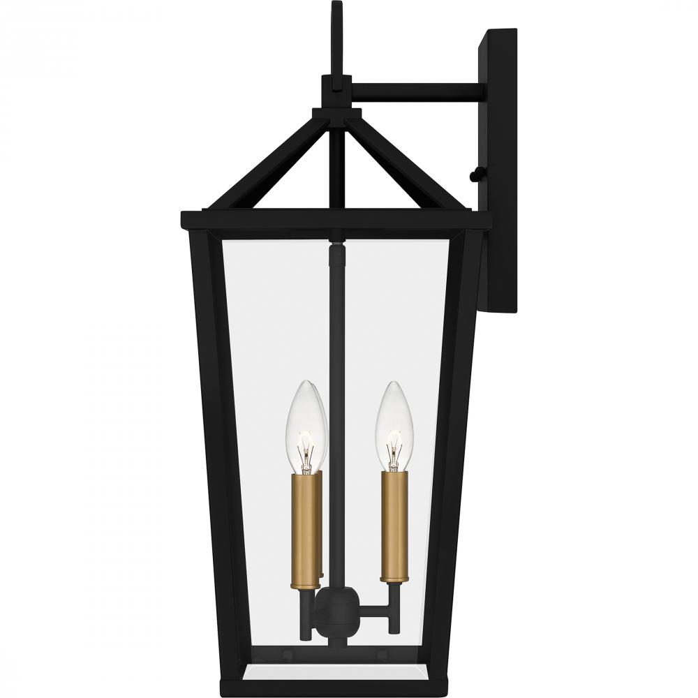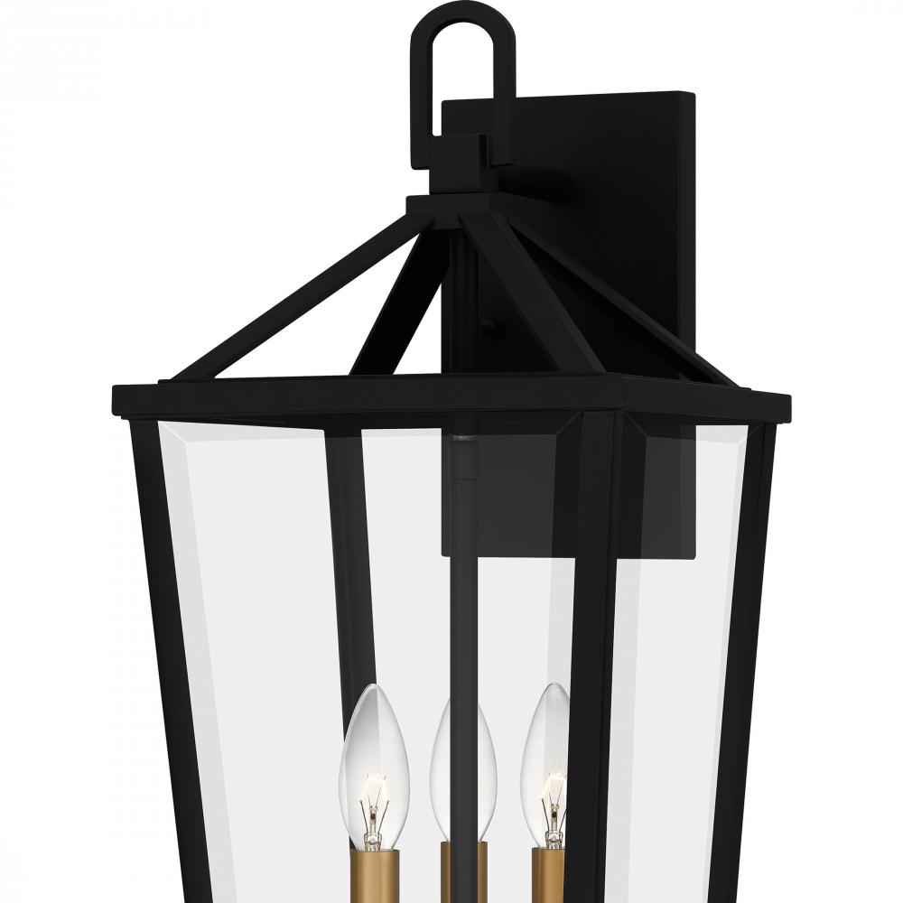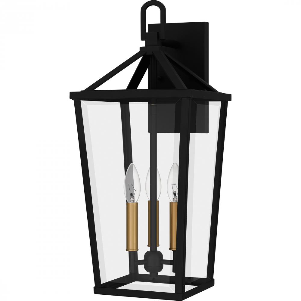 Hull is a traditional outdoor lantern collection designed for sleek exteriors. The tapered frame is finished in matte black and accented beautifully with gold candle sleeves for a hint of luster and industrial style. Clear beveled glass panels complete the