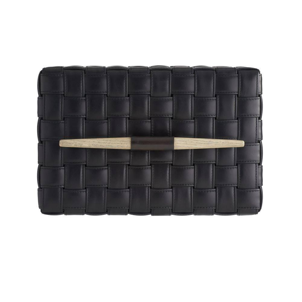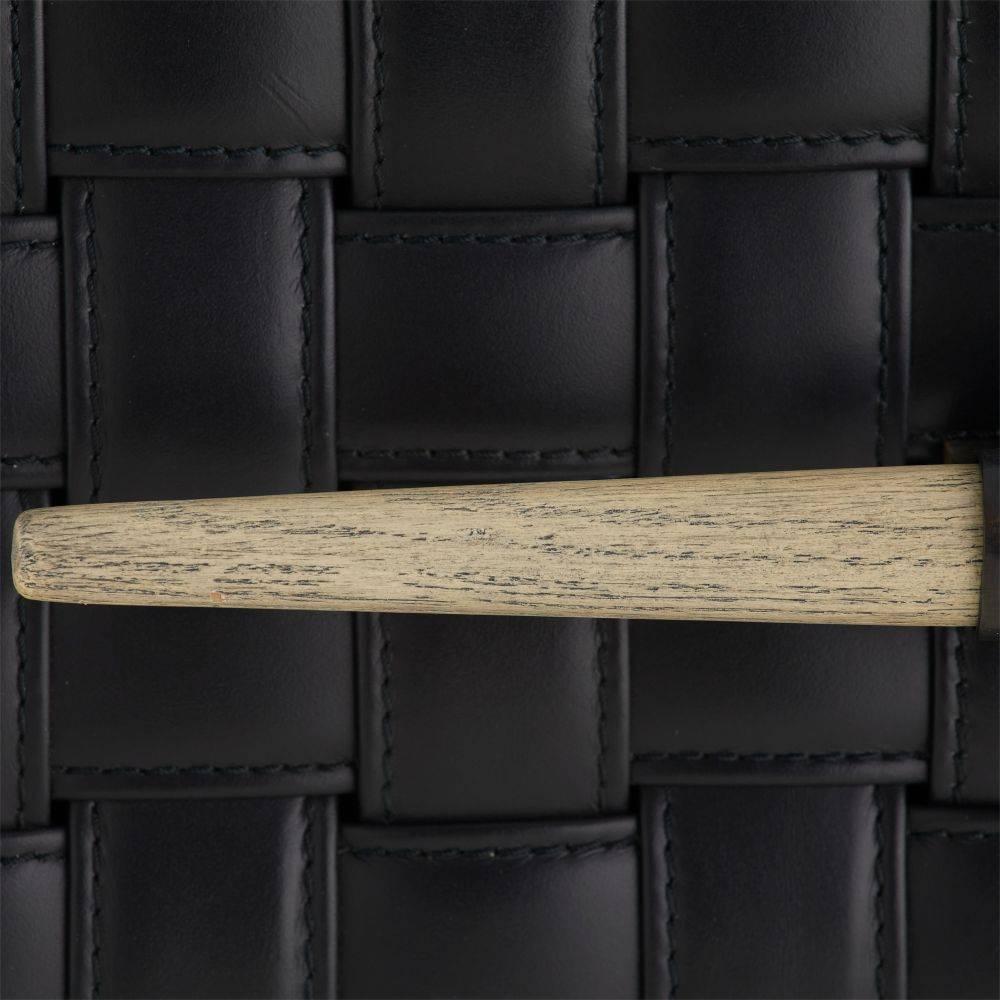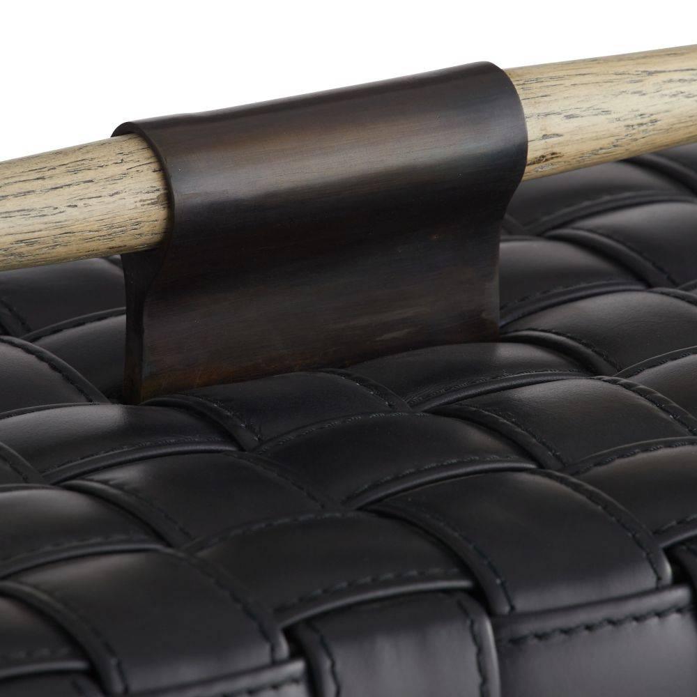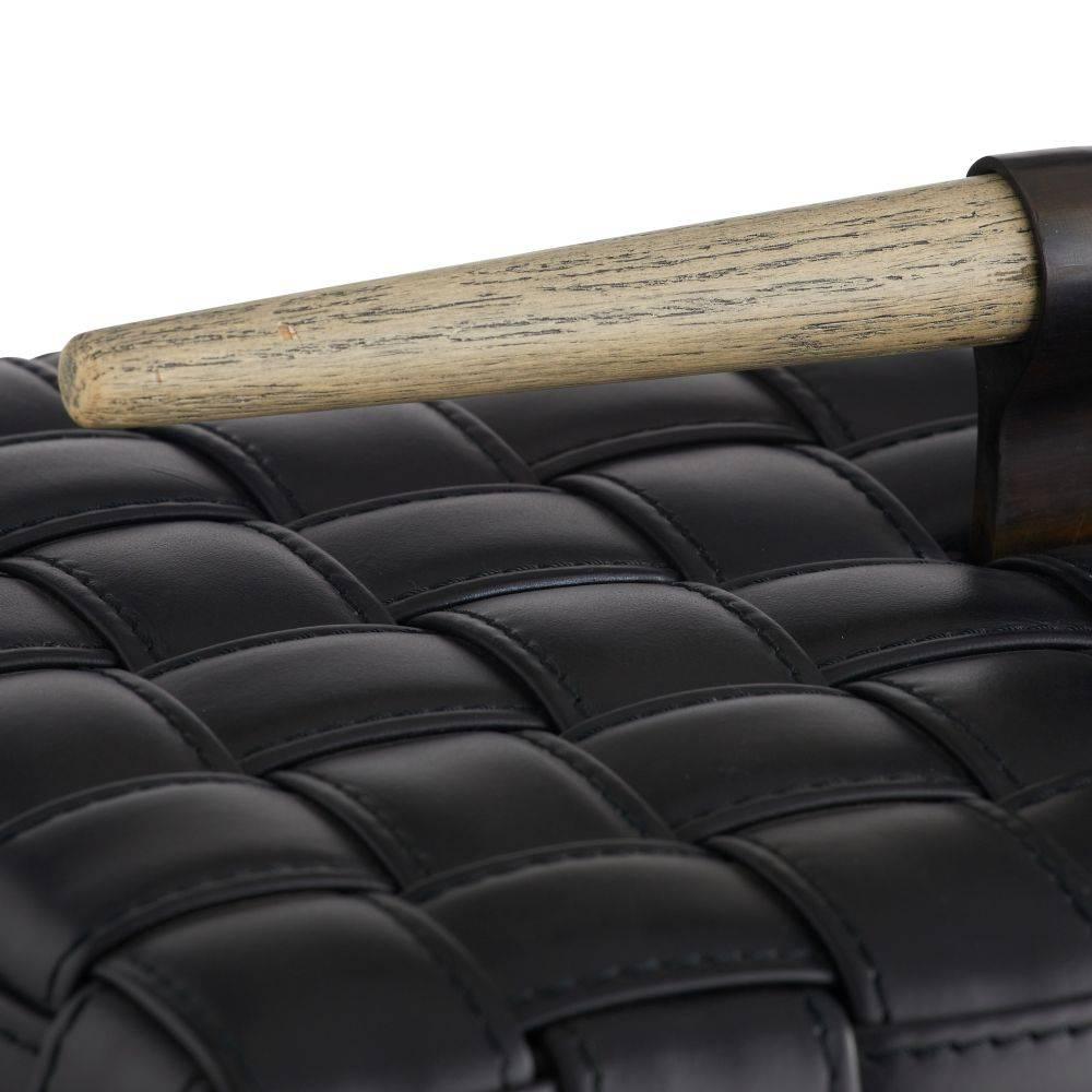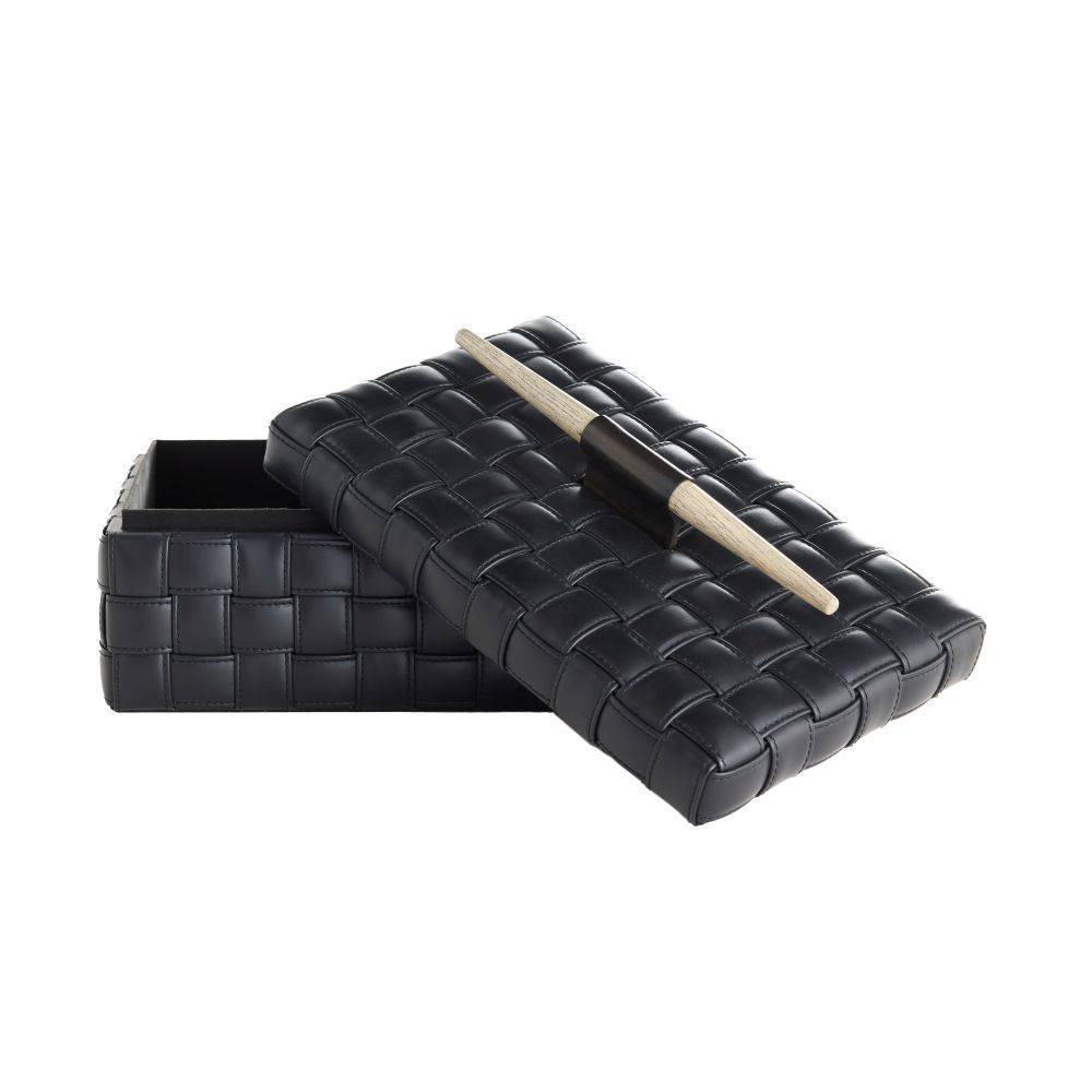 Our Humphrey Box is wrapped in a basketweave pattern of topstitched black leather. Accented with a spear-shaped handle of bronze-plated iron and smoke finished beechwood, it lends a masculine accent to a desk or tabletop. Finish will vary.