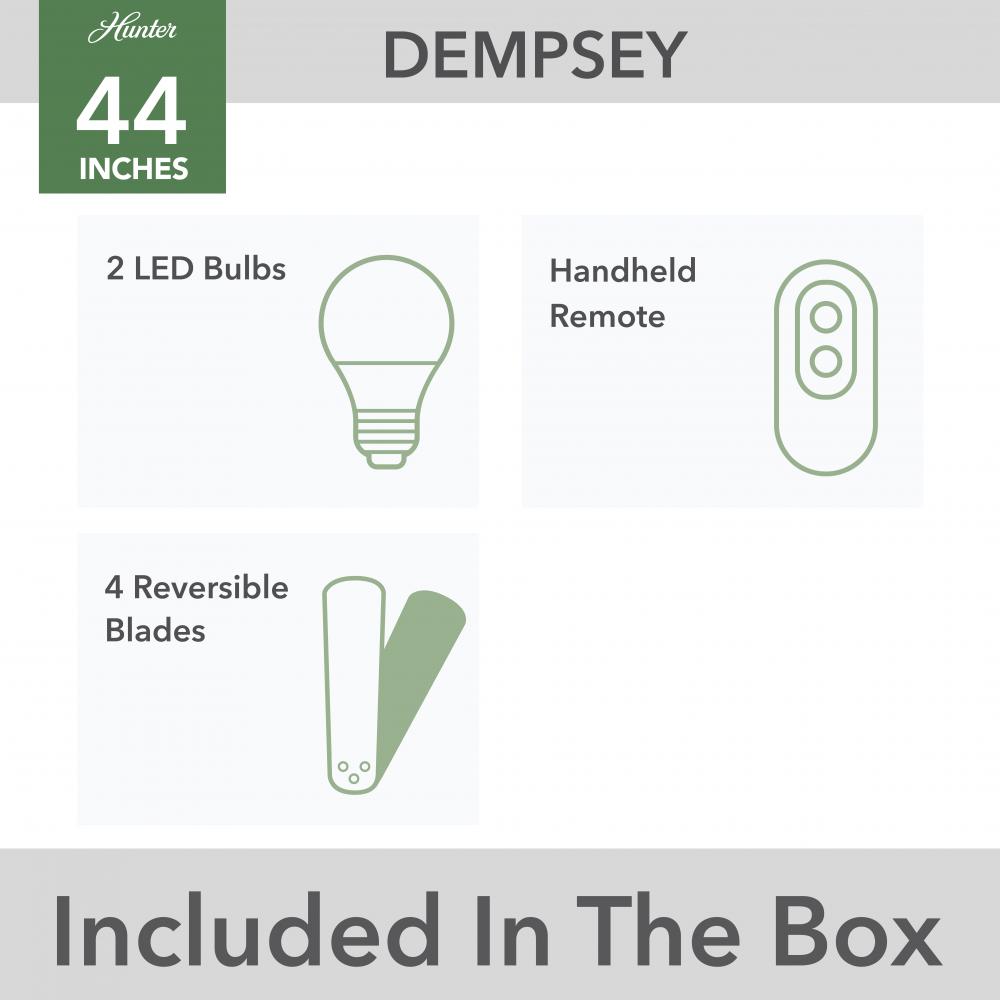 A contemporary fan with mass appeal, the Dempsey will fit flawlessly in your home's modern interior design. The beautiful, clean finish options work together with the high contrast of angles throughout the design to create a look that will keep your space looking current and inspired. Fully-dimmable, high-efficient LED bulbs give you total control over your lighting while the 44-inch blade span keeps the small rooms in your home feeling cool. We have a full collection of Dempsey fans so you can keep a consistent look while tailoring the size and features to each room in your house.