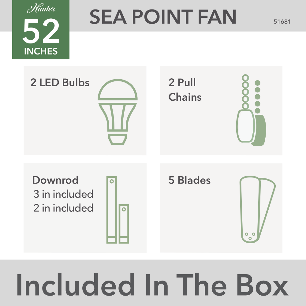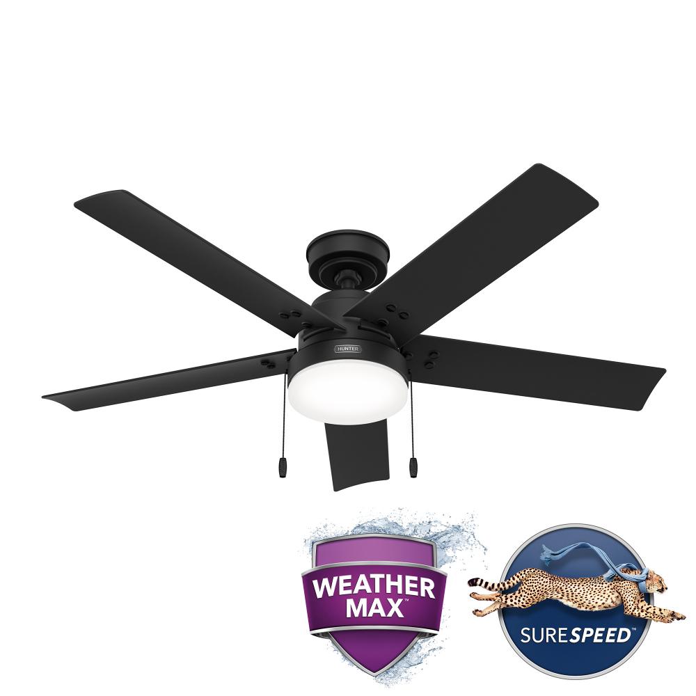 The Hunter Sea Point ceiling fan is an exercise in industrial elegance. Outfitted with our signature WeatherMax® technology, the corrosion-resistant Sea Point is engineered for the elements and tough enough to withstand direct exposure to rain or snow. The perfect pairing for your covered porch or patio, this ceiling fan can also grace any indoor space and is built with the cooling capacity for your home’s larger living areas.