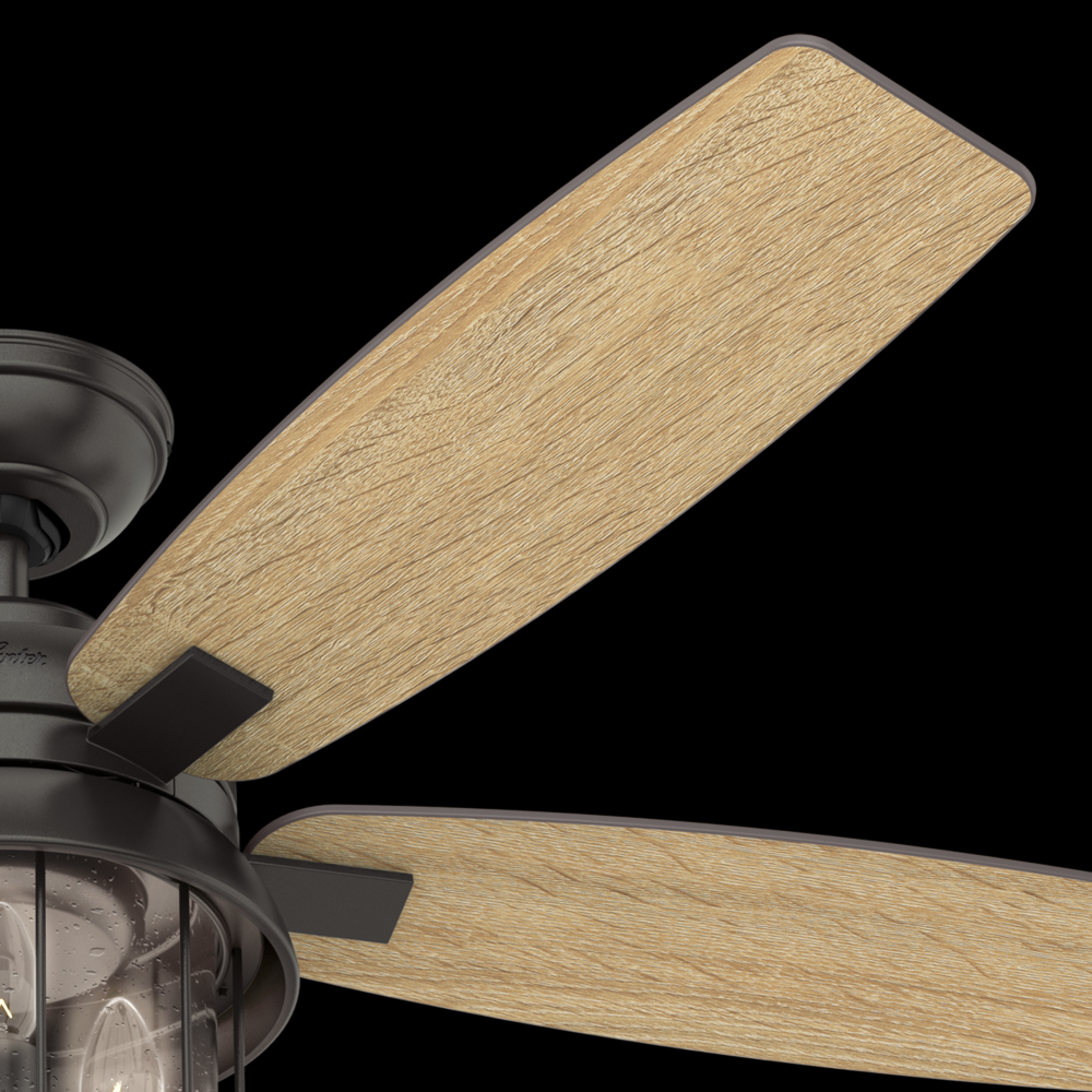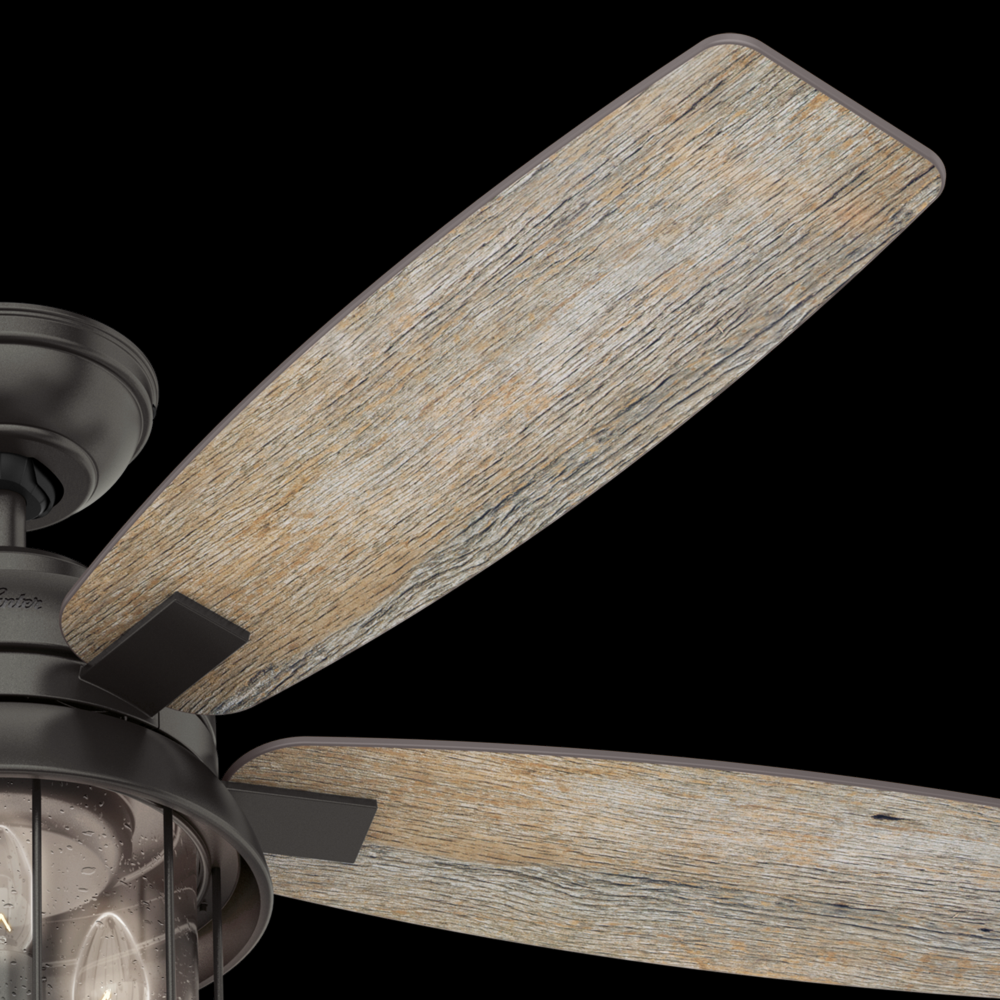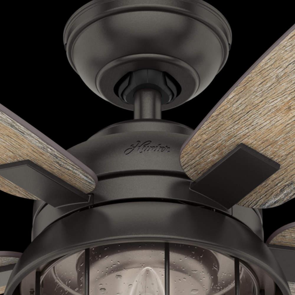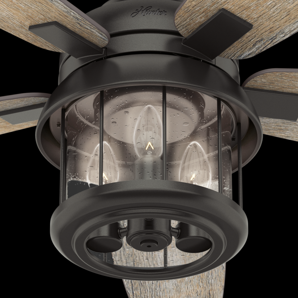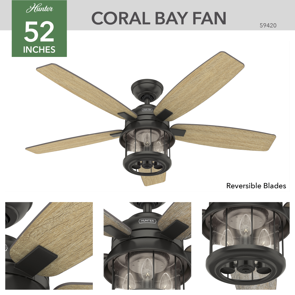 The Coral Bay chandelier ceiling fan features a lantern-style light fixture with three vintage, energy-efficient LED Edison bulbs encased in seeded glass. The Noble Bronze ceiling fan finish will complement your farmhouse decor. This rustic ceiling fan is damp-rated for use in covered porches and patios as well as indoor spaces like living rooms, bedrooms, and kitchens. The Coral Bay comes with a handheld remote for easy control of the fan speed and direction as well as lighting.