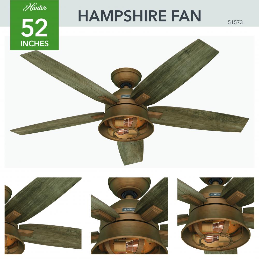 Powerful performance with a memorable design. Rustic finishes and wood grain detailing come together to form the 52-inch Hampshire ceiling fan. Influenced by farmhouse design, this fan brings the outdoorsy, rustic spirit inside to your favorite large rooms. Equipped with our SureSpeed® Guarantee, the Millington keeps your indoor spaces cool – without the noise.