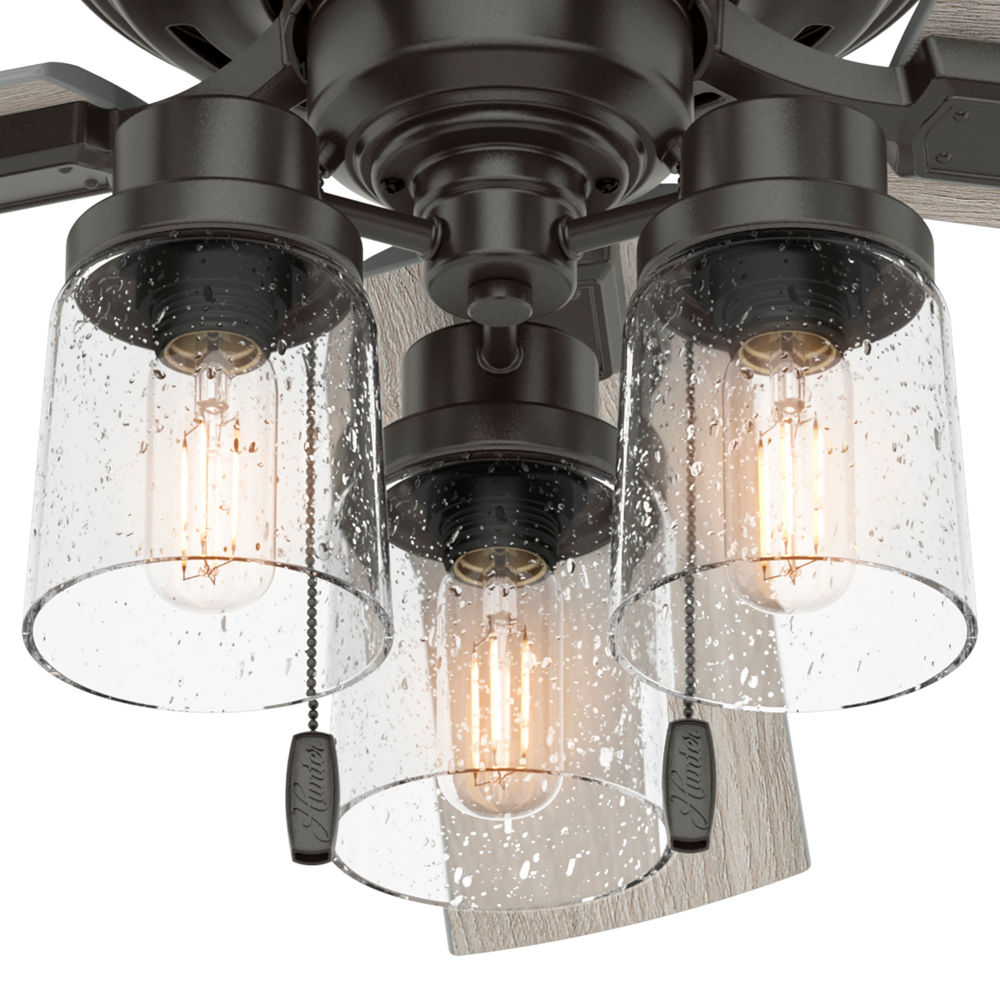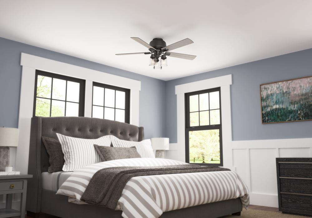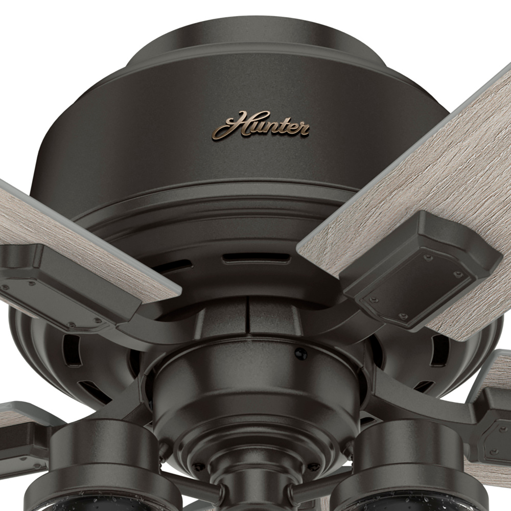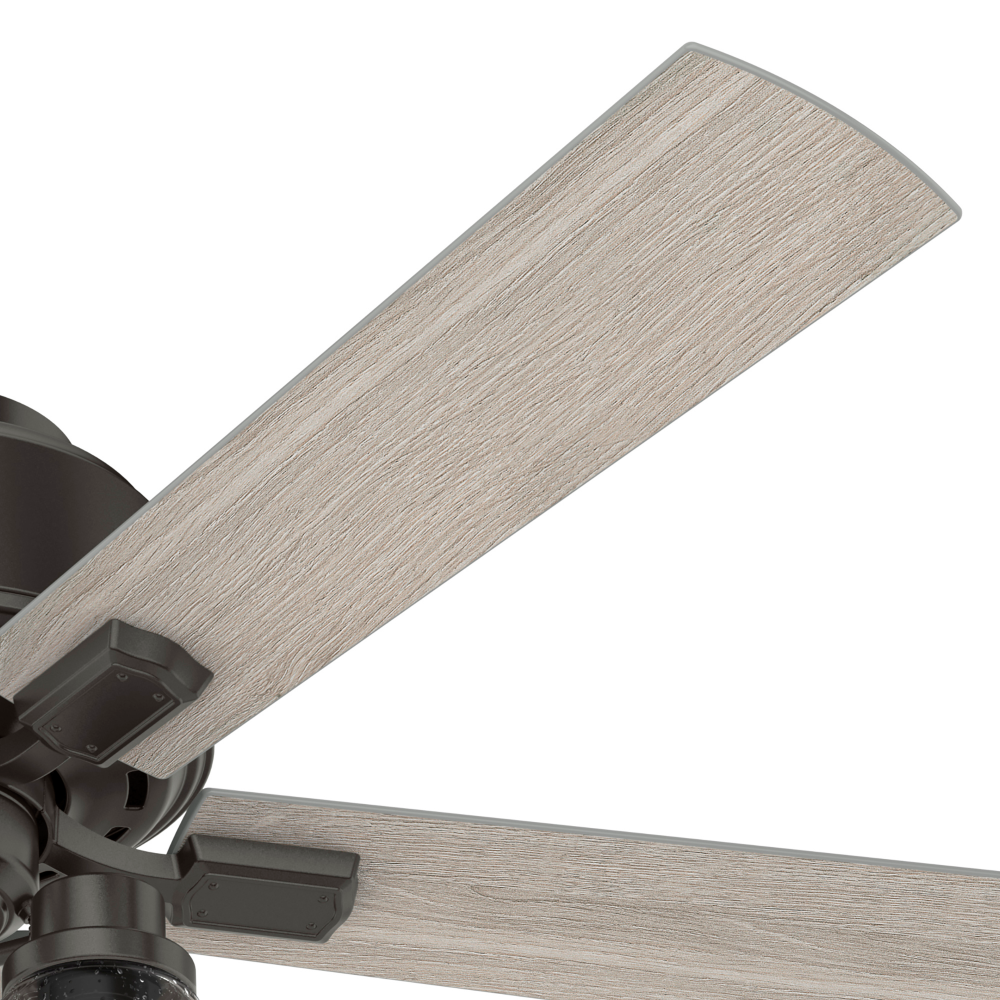 The Hartland chandelier-inspired ceiling fan’s clear-seeded glass and included Edison LED light bulbs create a stunning look in large, casual spaces. This large ceiling fan is designed to fit flush in rooms with ceilings less than 9 feet high. Use the Indigo Blue finish to add a subtle pop of color or complement other fixtures in your space with the Noble Bronze or Matte Silver finish. Create a cohesive look in your space by pairing the Hartland ceiling fan with the coordinating light fixtures in its collection.